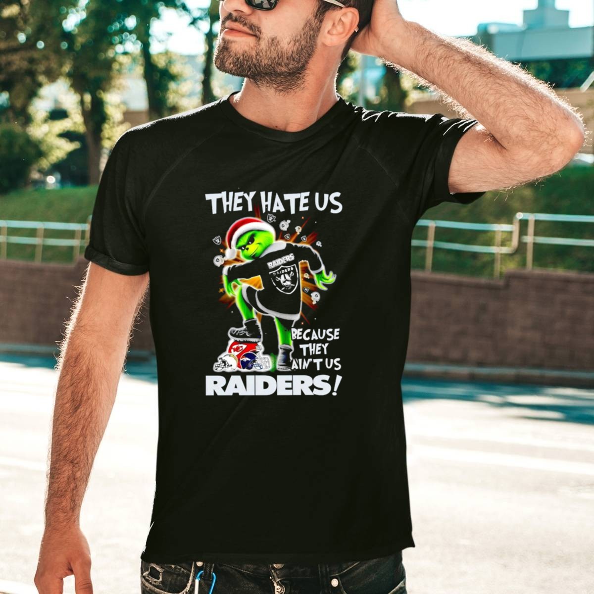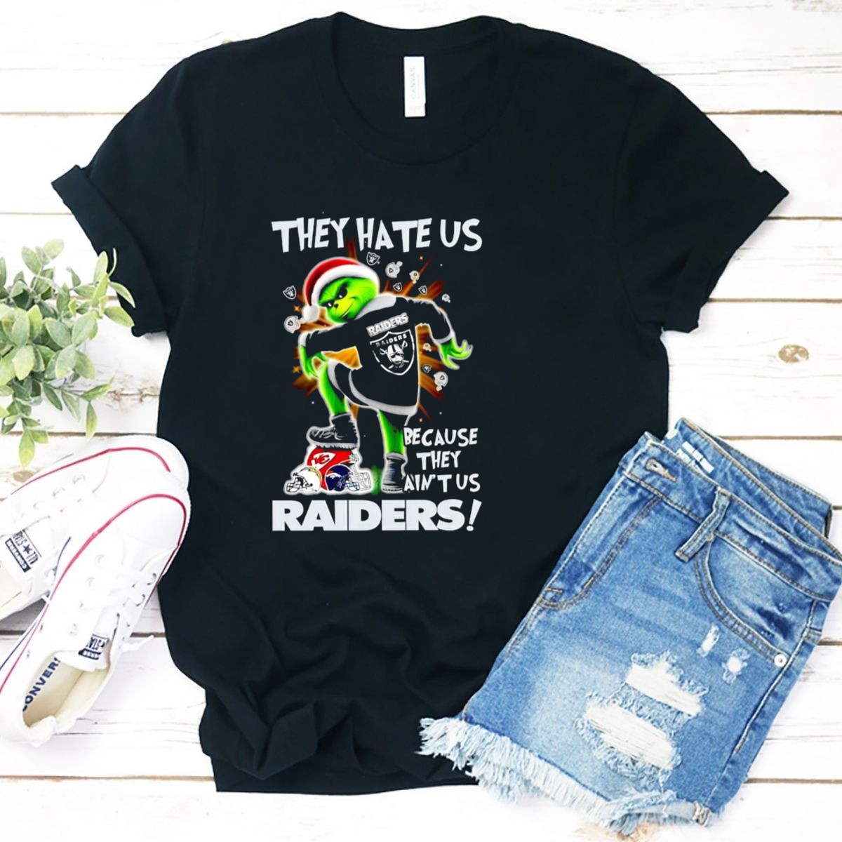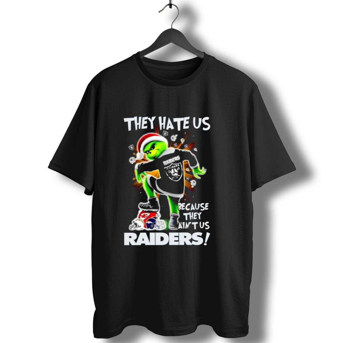 Get into the holiday spirit with our Grinch Raiders Christmas T-Shirt, a perfect blend of humor and festive cheer for fans of the Las Vegas Raiders, Kansas City Chiefs, and New England Patriots. This fan-made design showcases your team pride while adding a playful twist to your casual wardrobe. Ideal for themed events, daily wear, or simply lounging around during the festive season, this shirt is sure to turn heads and spark conversations wherever you go.