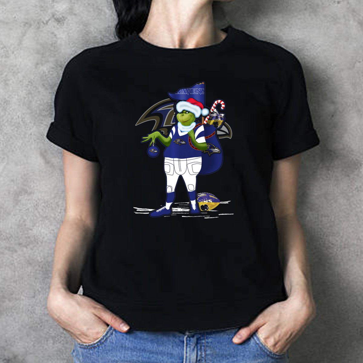 Grinch Santa Holding Candy Cane Bag and Baltimore Ravens Football in Ravens T-Shirt
