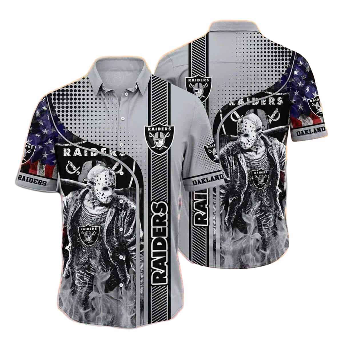 Embrace the spirit of Halloween with our exclusive Jason Voorhees Las Vegas Raiders Hawaiian Shirt! Perfect for fans of both the iconic slasher films and the vibrant energy of Las Vegas, this shirt is designed for anyone looking to stand out at summer gatherings, beach parties, or casual outings. Its unique graphic print combines the thrilling essence of horror with the sporty vibe of the Raiders, making it a one-of-a-kind addition to your wardrobe.