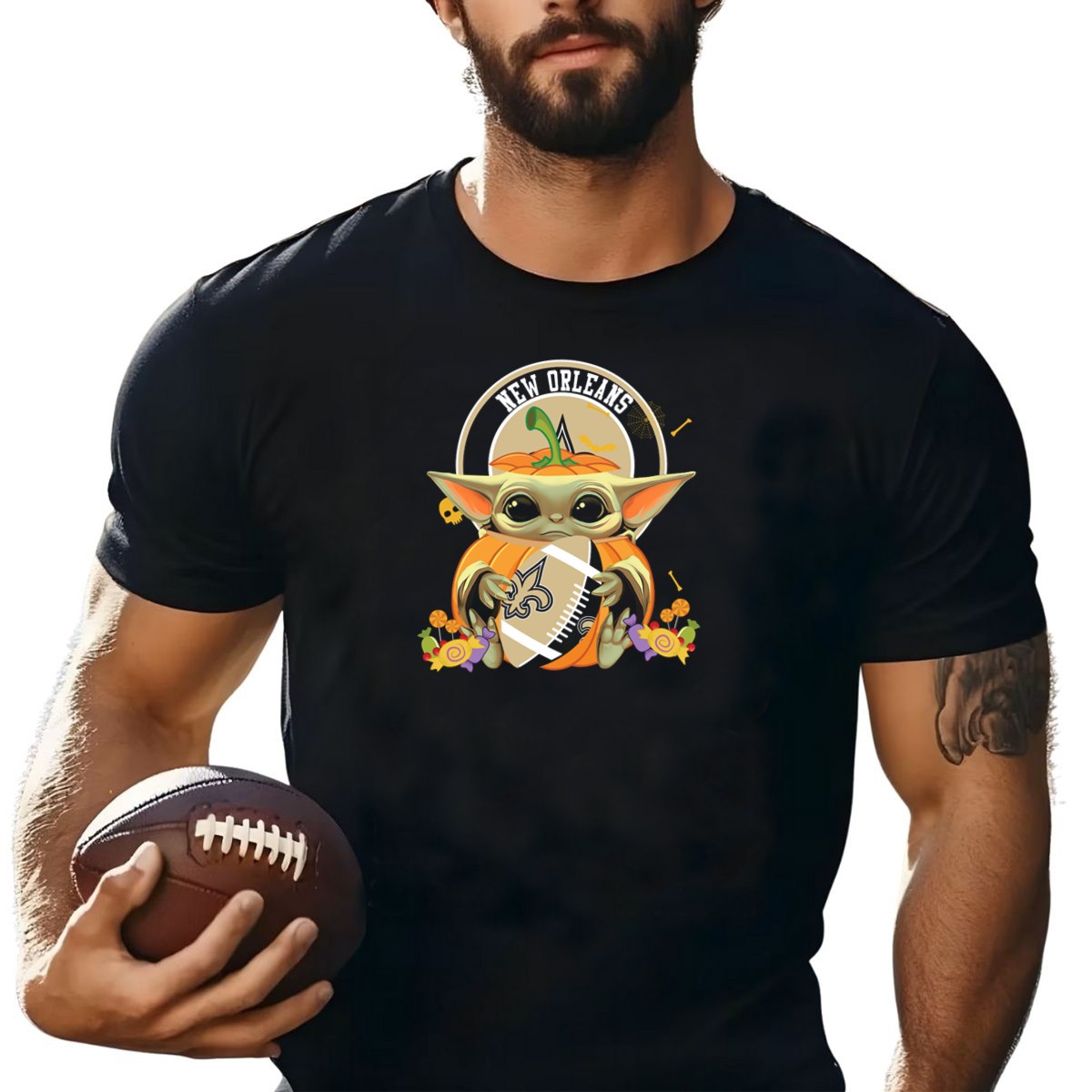 Embrace the spirit of Halloween with our fan-made “Pumpkin Baby Yoda Hug” T-shirt, perfect for every New Orleans Saints supporter! This unique design blends the beloved Baby Yoda with festive Halloween flair, making it an ideal choice for casual outings, themed events, or just showing off your team pride during the football season. Crafted for comfort and style, this shirt is a must-have for fans who love to celebrate in style.