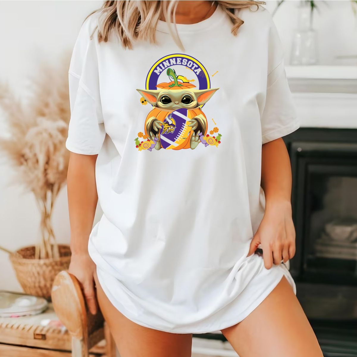 Get ready to celebrate Halloween in style with our fan-made Pumpkin Baby Yoda Minnesota Vikings T-Shirt! Perfect for die-hard Vikings fans and Star Wars enthusiasts alike, this unique design features the beloved Baby Yoda surrounded by festive pumpkin vibes, making it an ideal choice for casual wear, themed events, or simply lounging around. Crafted for comfort and durability, this classic-fit T-shirt is sure to become your go-to favorite for all-season fun.