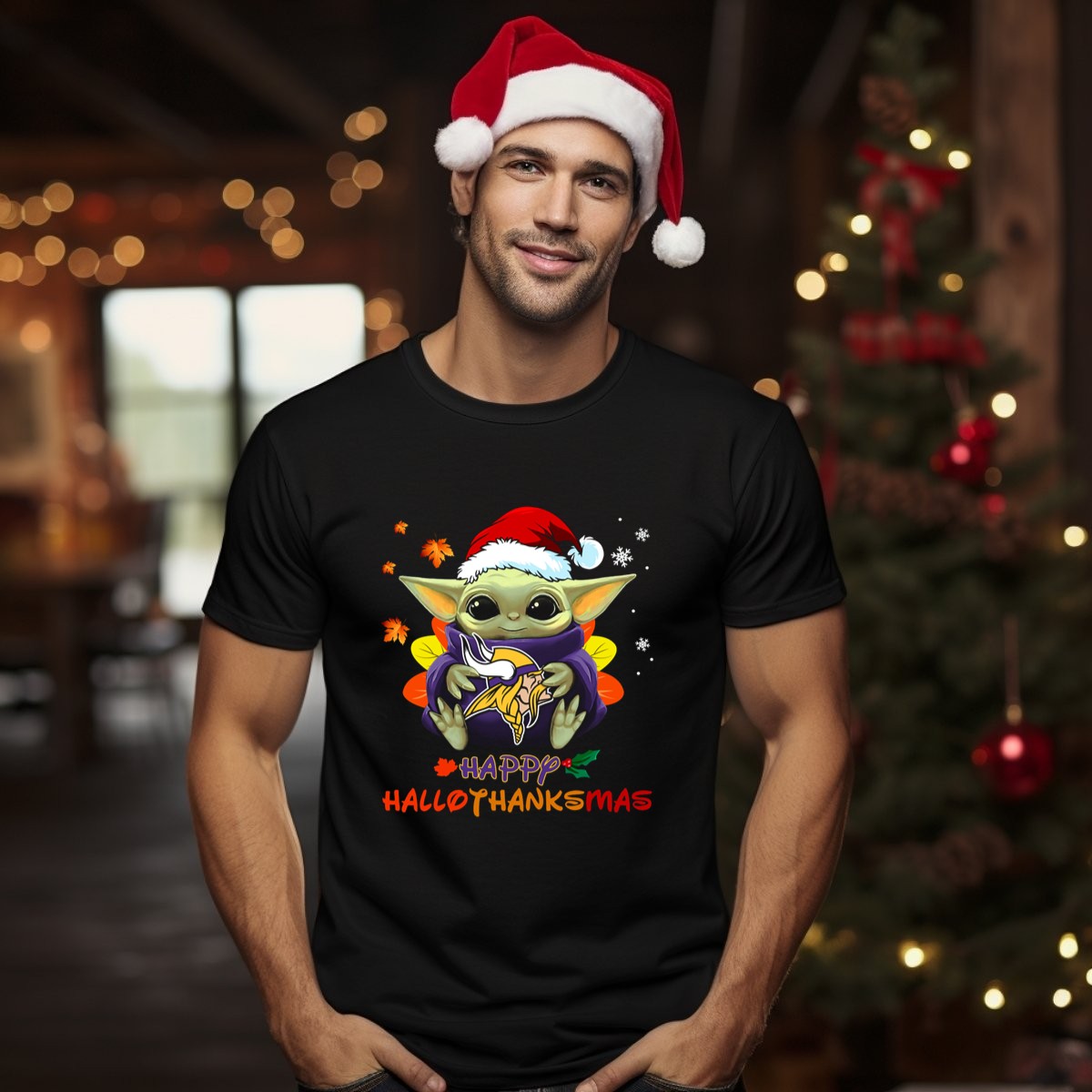 Celebrate the whimsical spirit of the holidays with our Happy Hallothanksmas Minnesota Vikings Baby Yoda T-shirt! Perfect for fans of all ages, this fun and unique design combines your love for the Vikings and the beloved Baby Yoda in a playful way. Ideal for casual outings, themed events, or simply lounging around, this shirt is a must-have for any die-hard fan looking to showcase their team pride with a touch of holiday cheer!