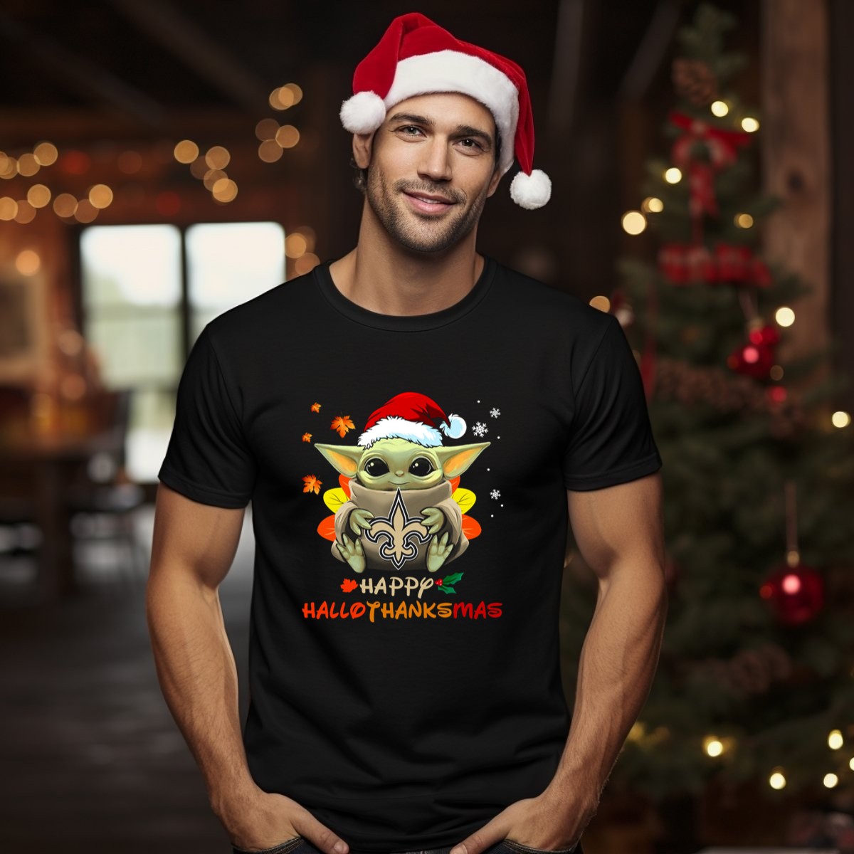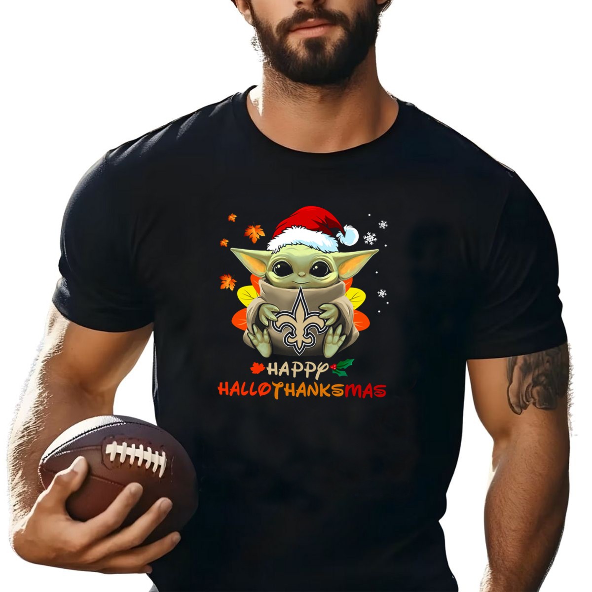Celebrate the holiday season with a fun twist on your favorite fandom in our Happy Hallothanksmas New Orleans Saints Baby Yoda T-Shirt! Perfect for fans who love to showcase their team spirit while embracing the joy of the holidays, this shirt is ideal for casual outings, themed events, or simply lounging at home. Featuring a delightful design that combines the beloved Baby Yoda with festive cheer, this shirt stands out as a unique addition to your wardrobe, making it a must-have for any die-hard fan.