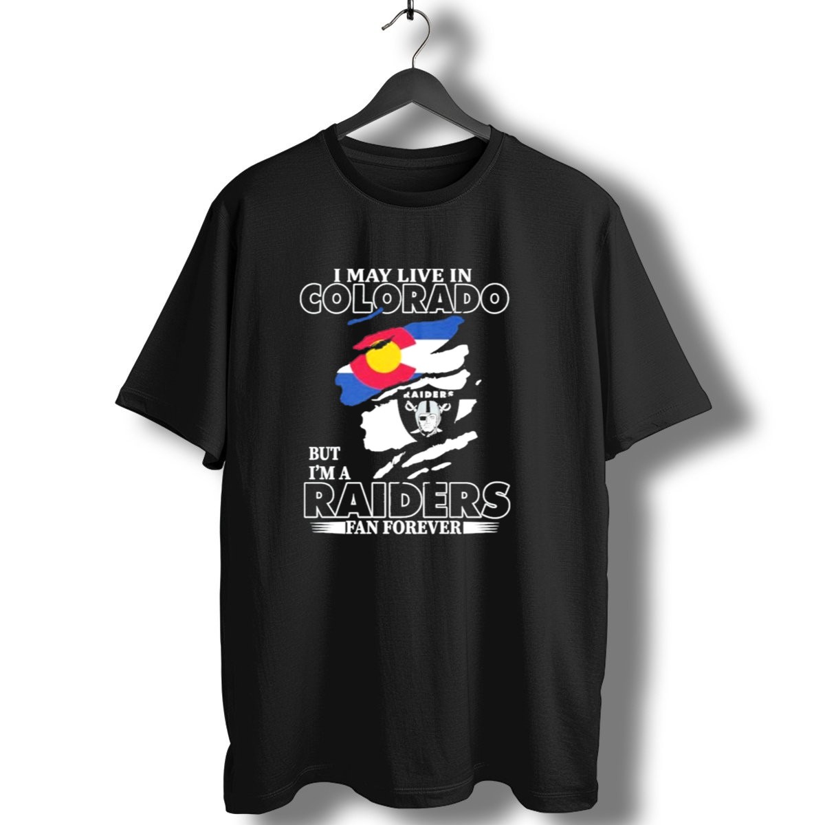 Show off your loyalty with our I May Live In Colorado But I’m A Raiders Fan Forever T-shirt! Perfect for die-hard Raiders fans who also embrace their Colorado roots, this shirt combines team spirit with a touch of local pride. Whether you’re at a game, a casual hangout, or a themed event, this fan-made design, printed right here in the USA, makes a bold statement that celebrates both your favorite team and your home state.