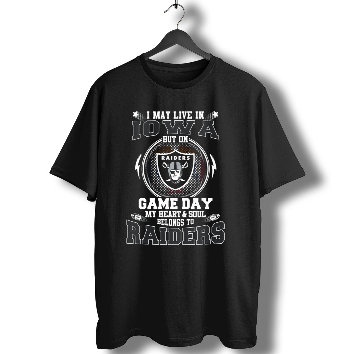 Show off your team spirit with our “I May Live In Iowa But On Game Day My Heart And Soul Belongs To Raiders” T-shirt! Perfect for die-hard fans and casual wearers alike, this shirt is designed for those who proudly support their team no matter where they are. Whether you’re cheering from the stands or watching the game at home, this fan-made design, printed in the USA, will keep you comfortable and stylish while showcasing your loyalty.