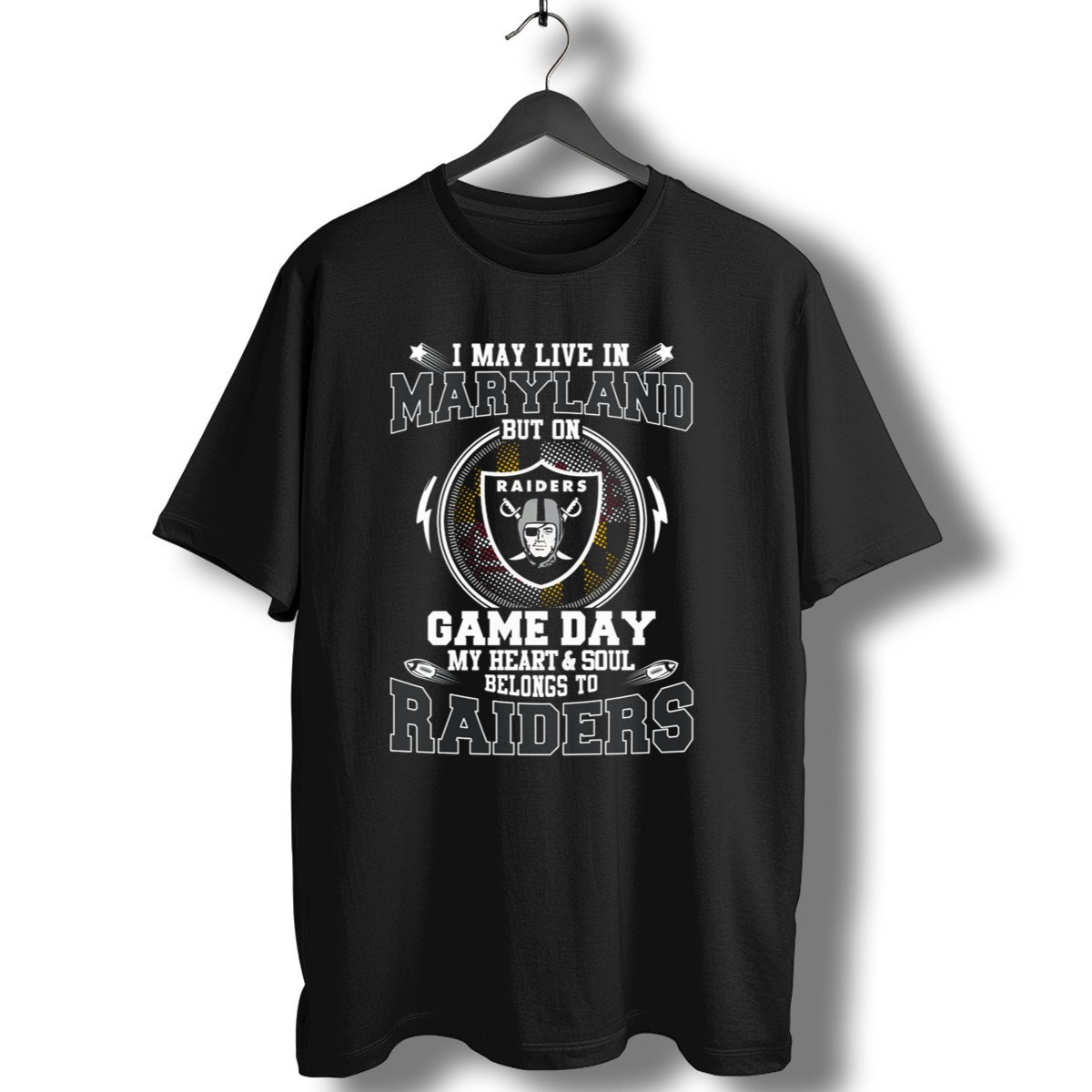 Show your unwavering loyalty to the Raiders with our fan-made “I May Live In Maryland But On Game Day My Heart And Soul Belongs To Raiders” T-shirt. Perfect for die-hard fans and casual wearers alike, this classic tee is ideal for game days, themed events, or simply showcasing your team spirit in everyday life. Made from soft and breathable 100% cotton, it’s as comfortable as it is stylish, making it a must-have for any Raiders supporter!