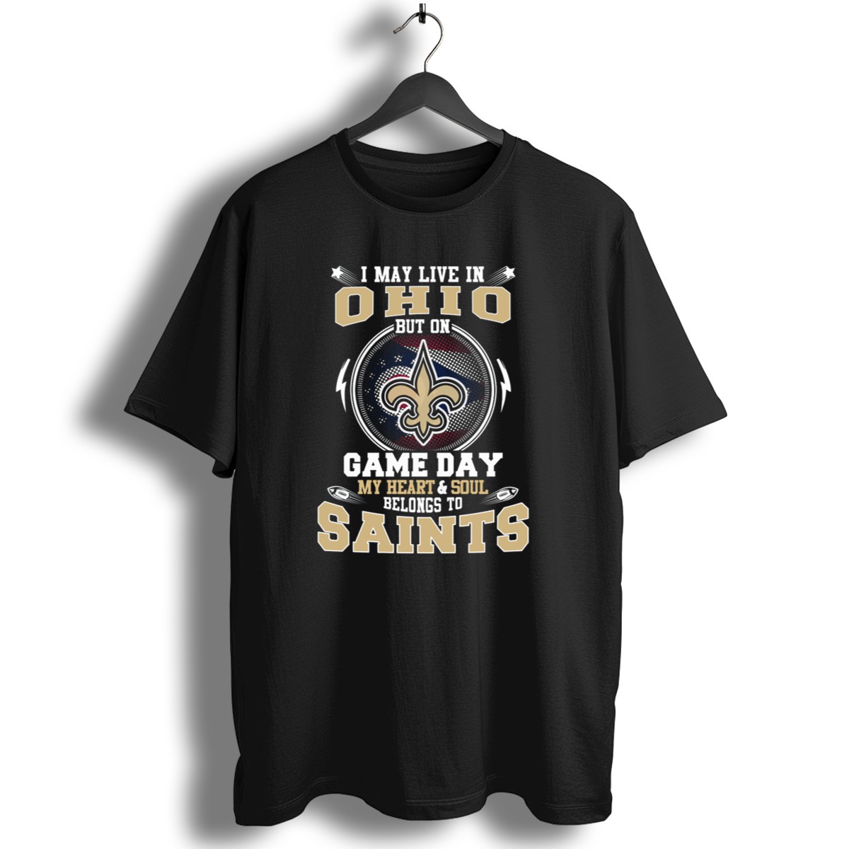 Show your unwavering support for the Saints with our “I May Live In Ohio But On Game Day My Heart And Soul Belongs To Saints” T-shirt! Perfect for fans who want to express their allegiance, this shirt is an essential addition to your game day wardrobe. Whether you’re watching the game at home, tailgating with friends, or attending themed events, this comfortable and stylish tee is sure to make a statement. Made with pride in the USA, it’s a fan-made design that embodies true team spirit!