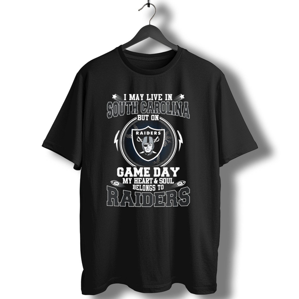 Show your unwavering support for the Raiders while celebrating your Southern roots with our “I May Live In South Carolina But On Game Day My Heart And Soul Belongs To Raiders” T-shirt. Perfect for die-hard fans, this shirt combines comfort and style, making it ideal for casual outings, themed events, or simply cheering from your couch. With a fan-made design printed in the USA, this T-shirt is a unique way to express your loyalty and passion for your team.
