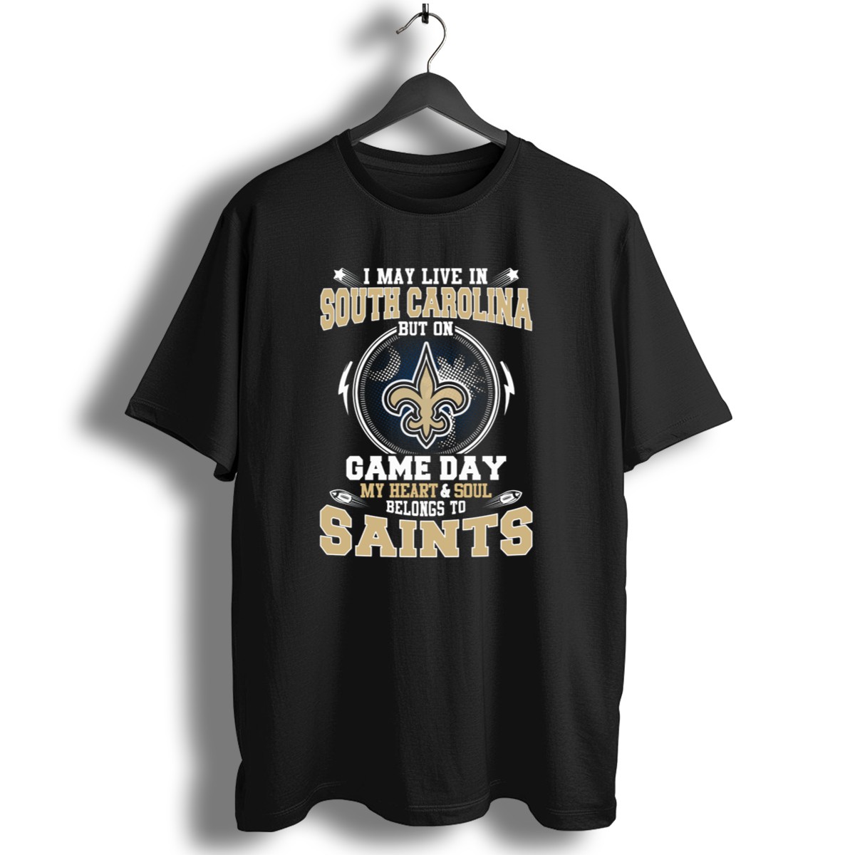 Show off your team spirit with our “I May Live In South Carolina But On Game Day My Heart And Soul Belongs To Saints” T-shirt! This fan-made design is perfect for dedicated New Orleans Saints supporters who want to showcase their love for the team, no matter where they are. Ideal for casual outings, themed events, or just lounging at home, this shirt combines comfort with a bold statement, making it a must-have for any true fan.