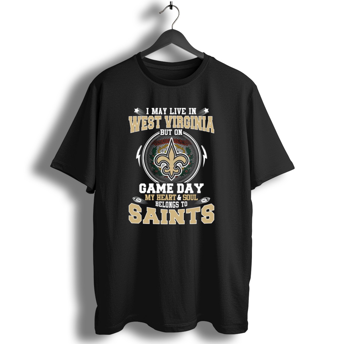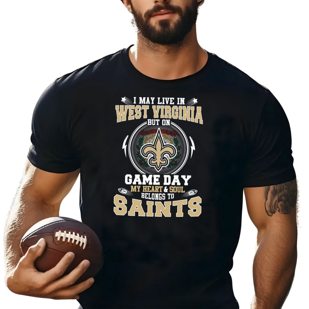Show your unwavering support for the Saints with our “I May Live In West Virginia But On Game Day My Heart And Soul Belongs To Saints” T-shirt. Perfect for passionate fans, this shirt is designed for casual wear, themed events, and daily outings. Its eye-catching design makes it a unique addition to any fan’s wardrobe, allowing you to proudly showcase your loyalty wherever you go!