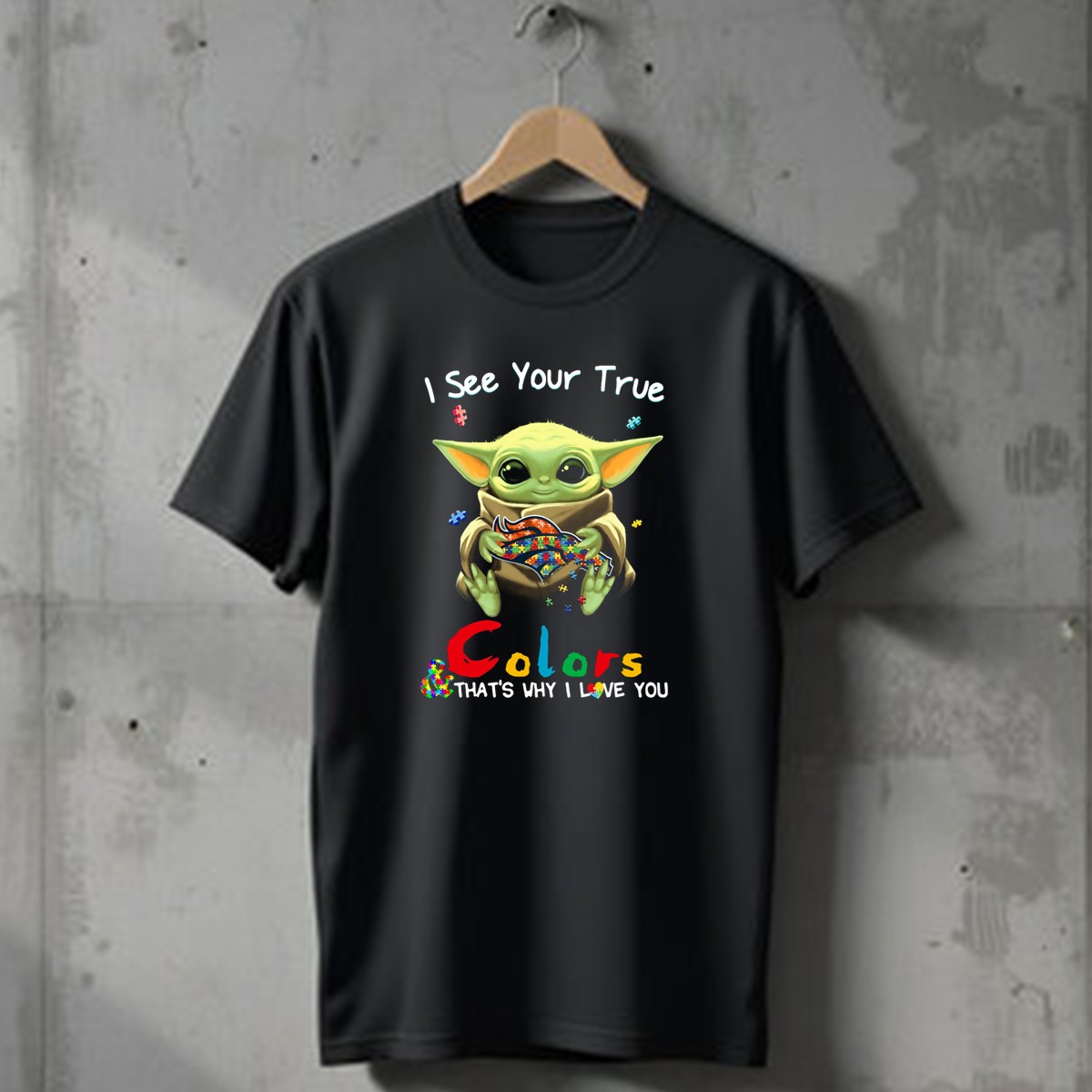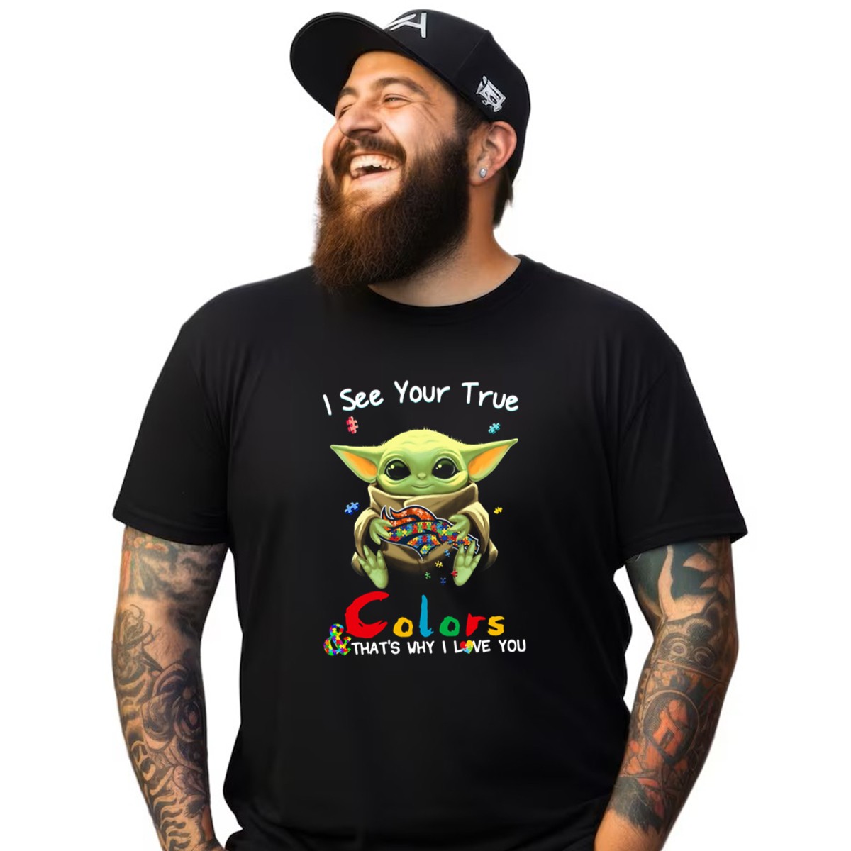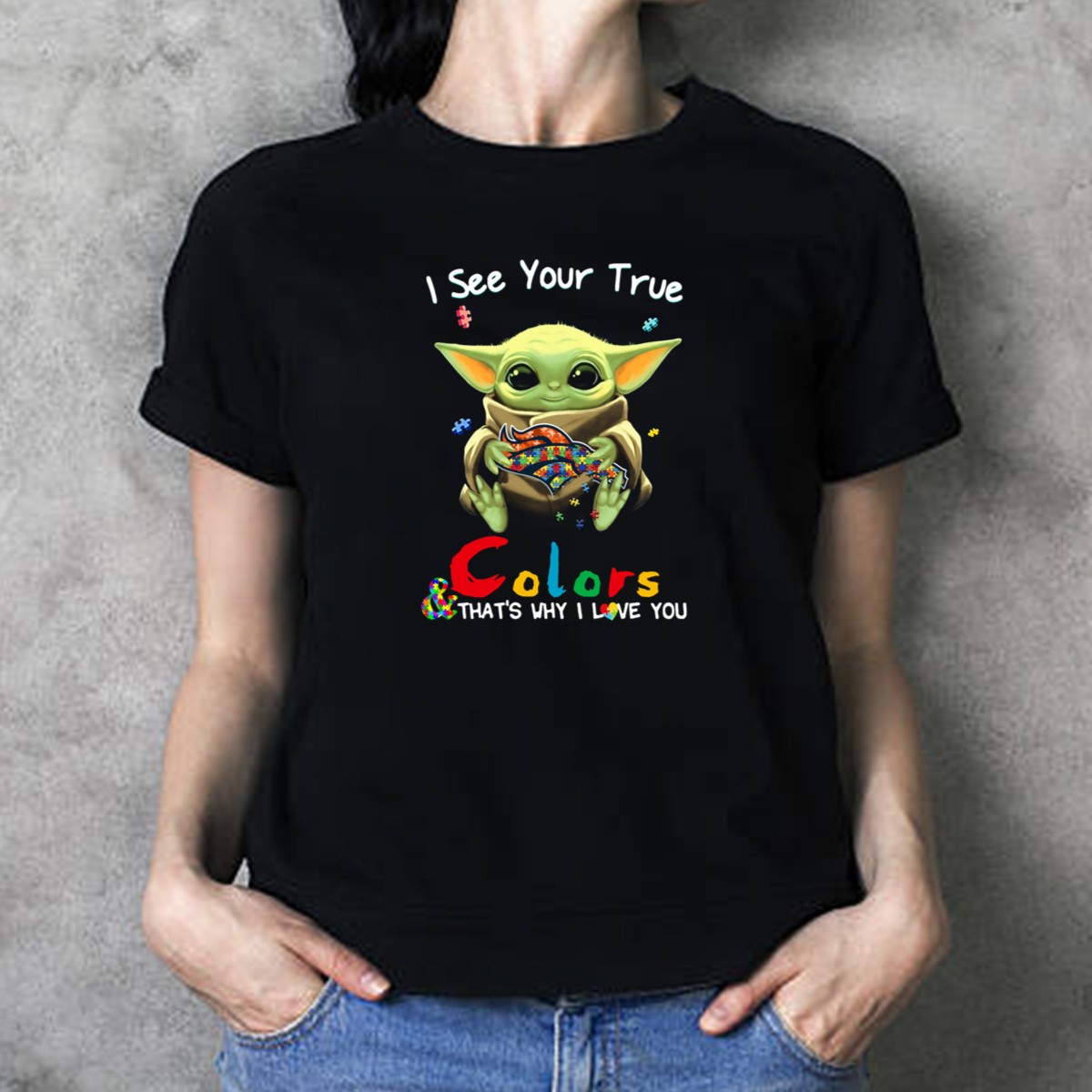 I See Your True Colors Thats Why I Love You Denver Broncos Puzzle Baby Yoda T-Shirt