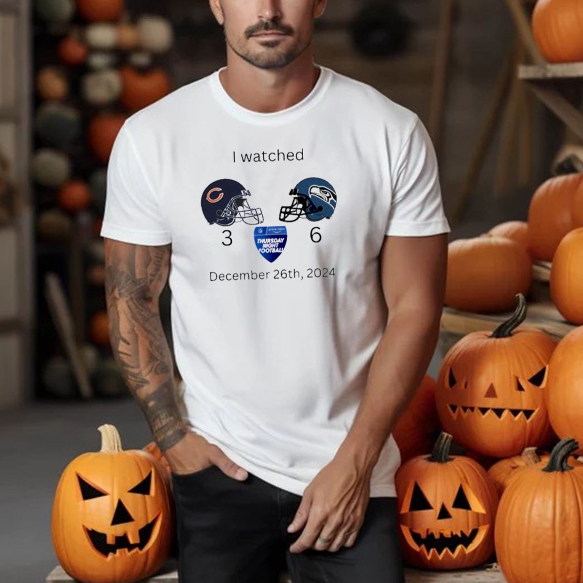 Show your passion for the game with our fan-made “I Watched Chicago Bears 3 Vs Seattle Seahawks 6 Thursday Night Football December 26th” T-shirt! Perfect for die-hard football enthusiasts, this shirt is an ideal choice for casual outings, themed events, or simply cheering for your favorite team from the comfort of your home. Made with love and printed in the USA, it captures the excitement of the match while providing comfort and style.