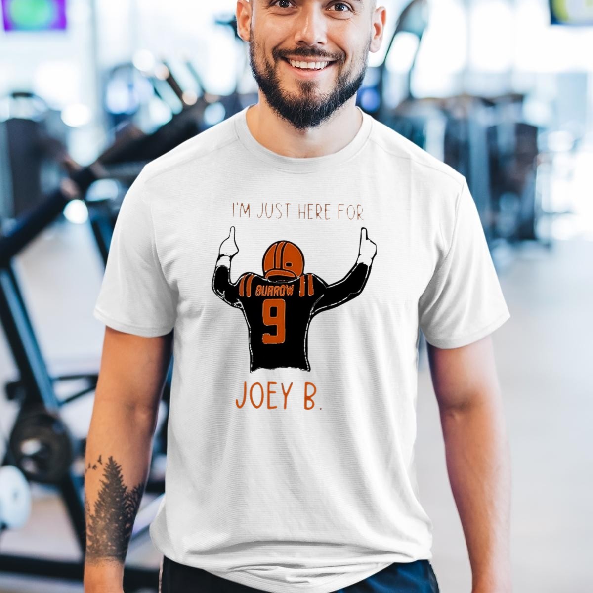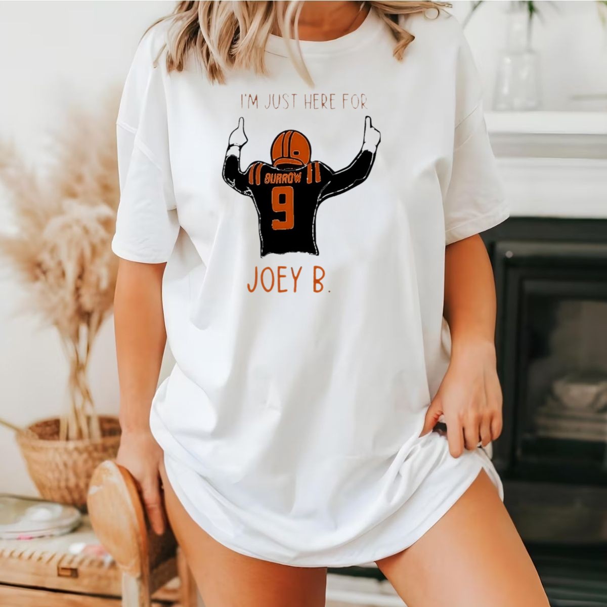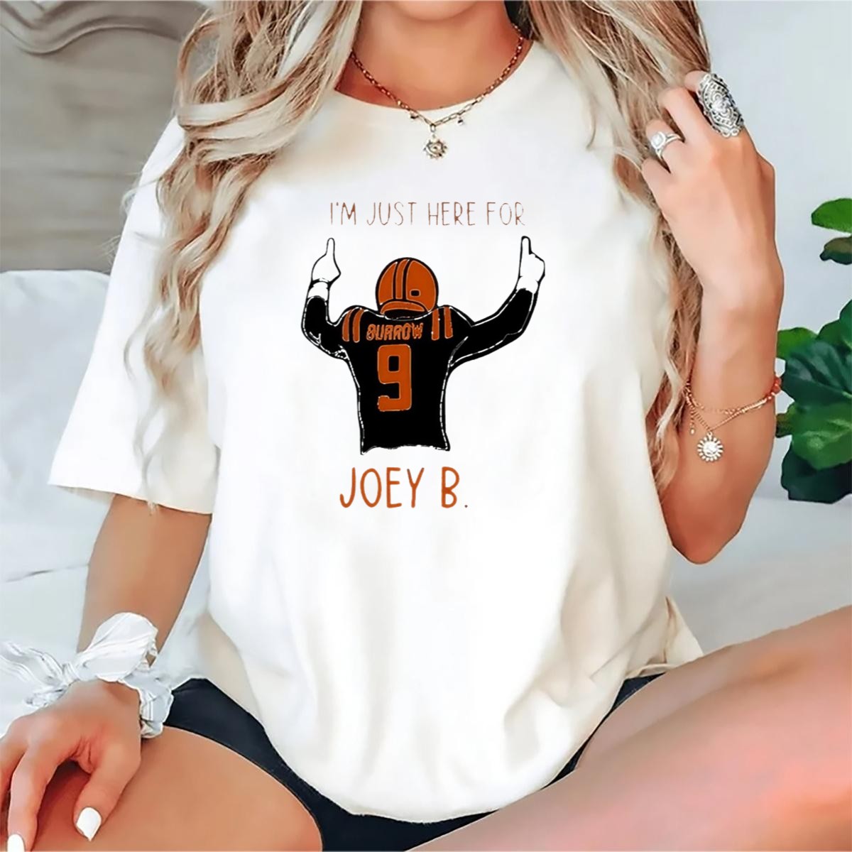 Show off your Bengals pride with our “I’m Just Here for Joey B Burrow” T-shirt! Perfect for die-hard Cincinnati fans, this fan-made design celebrates your love for the team and its star quarterback in style. Whether you’re at a game, hosting a watch party, or just hanging out with friends, this shirt is a great way to showcase your team spirit while keeping it casual. The high-quality print ensures you’ll stand out wherever you go!
