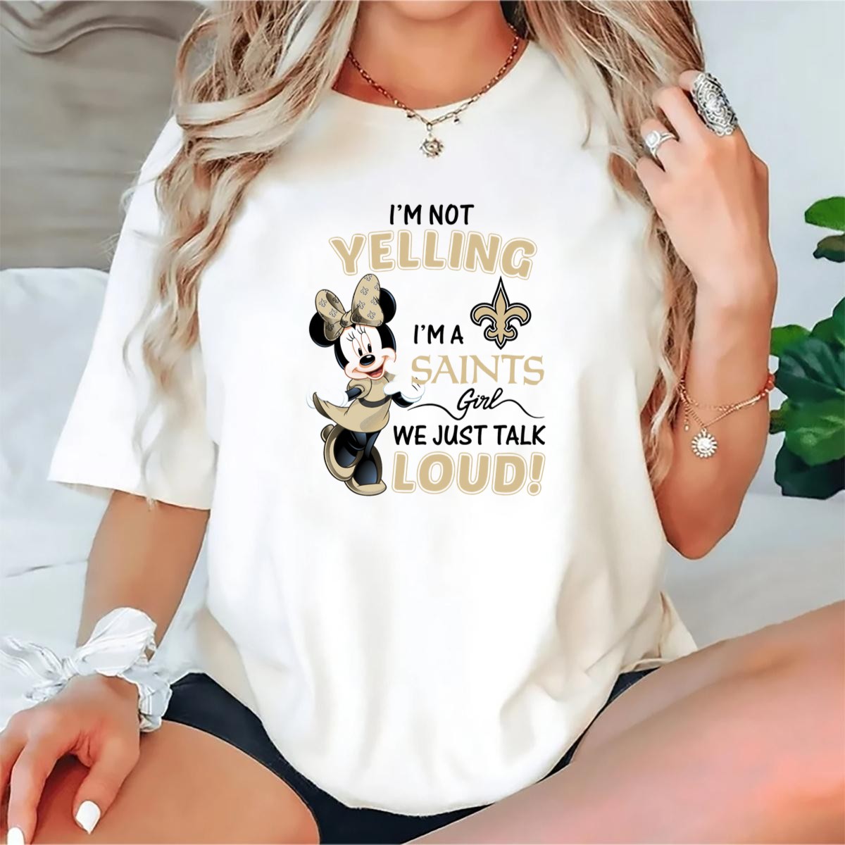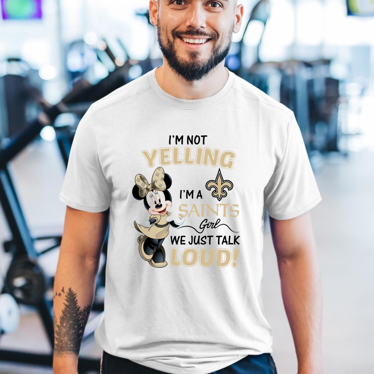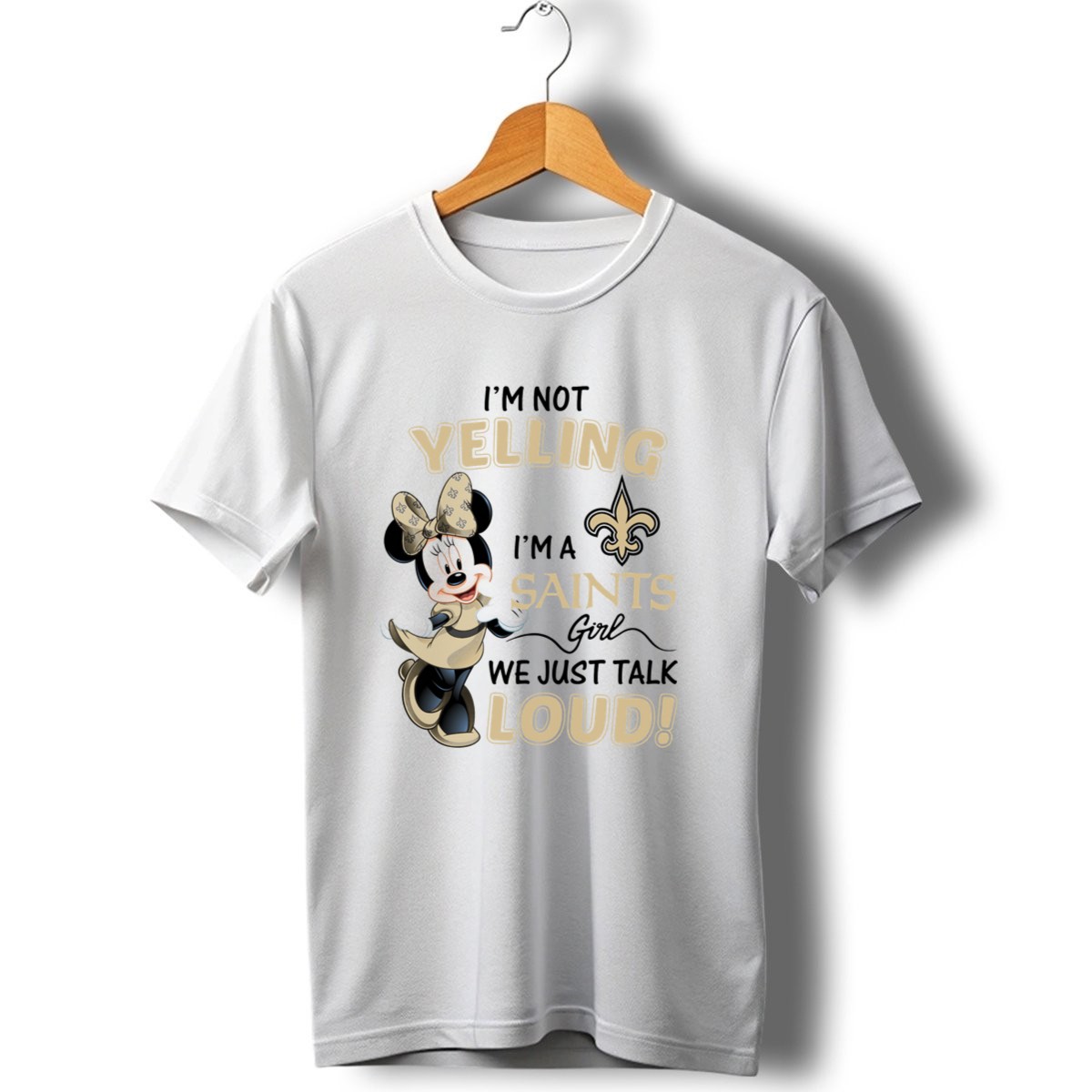Show your passion for the New Orleans Saints with our “I’m Not Yelling, I’m a Saints Girl” T-shirt featuring a fun Minnie Mouse design. Perfect for die-hard fans and those who love to cheer on their team in style, this shirt is ideal for casual outings, themed events, or simply showing off your team spirit every day. With its unique fan-made print, this shirt perfectly combines love for the Saints with a touch of playful charm.