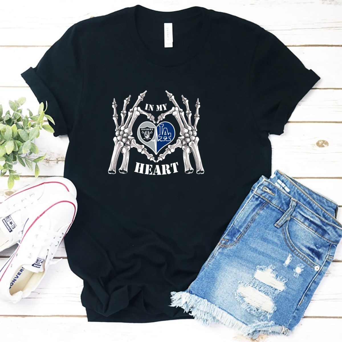 Show off your team spirit with our fan-made “In My Heart Raiders Dodgers Skeleton Hands T-Shirt.” Perfect for die-hard fans, this unique design captures the essence of both the Raiders and Dodgers, making it an ideal choice for casual outings, themed events, or daily wear. Crafted from soft, durable 100% cotton, this shirt ensures you stay comfortable while showcasing your love for your teams, all season long!
