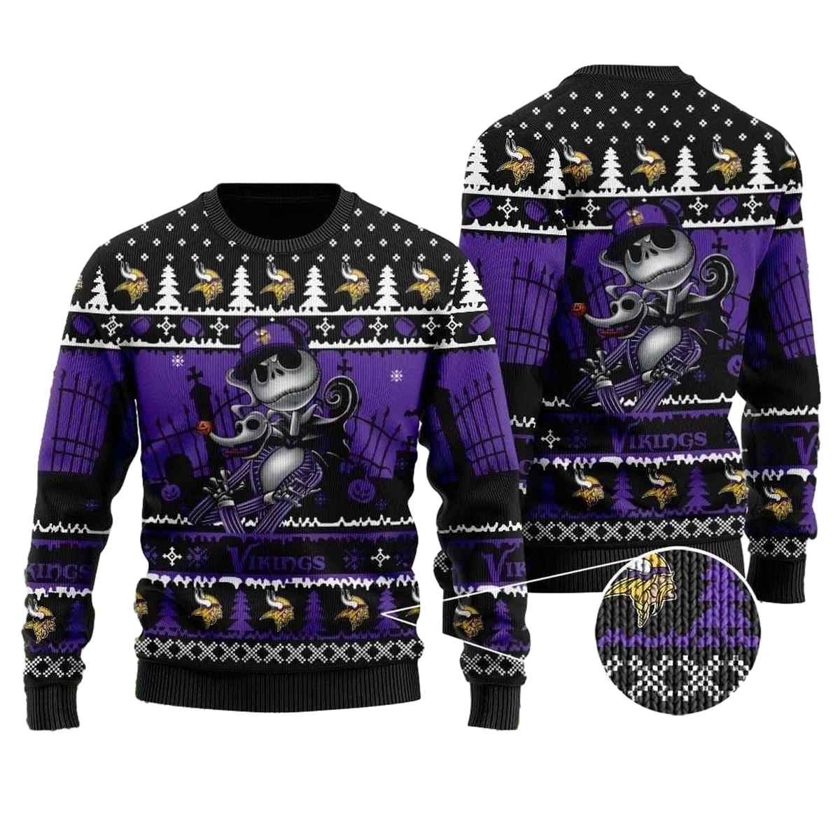 Get ready to bring some spooky cheer to your winter festivities with our Jack Skellington Minnesota Vikings Halloween Ugly Christmas Sweater! Perfect for fans of both Halloween and the beloved football team, this fun-loving sweater is ideal for holiday parties, game days, or simply lounging at home while enjoying the cozy vibes of the season. The unique design combines iconic elements that make it a standout piece for anyone looking to add some personality to their winter wardrobe.