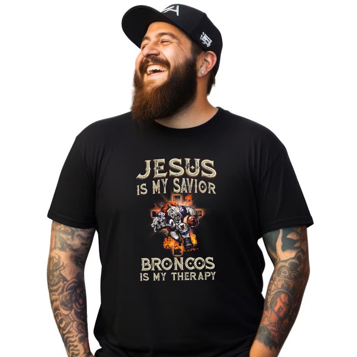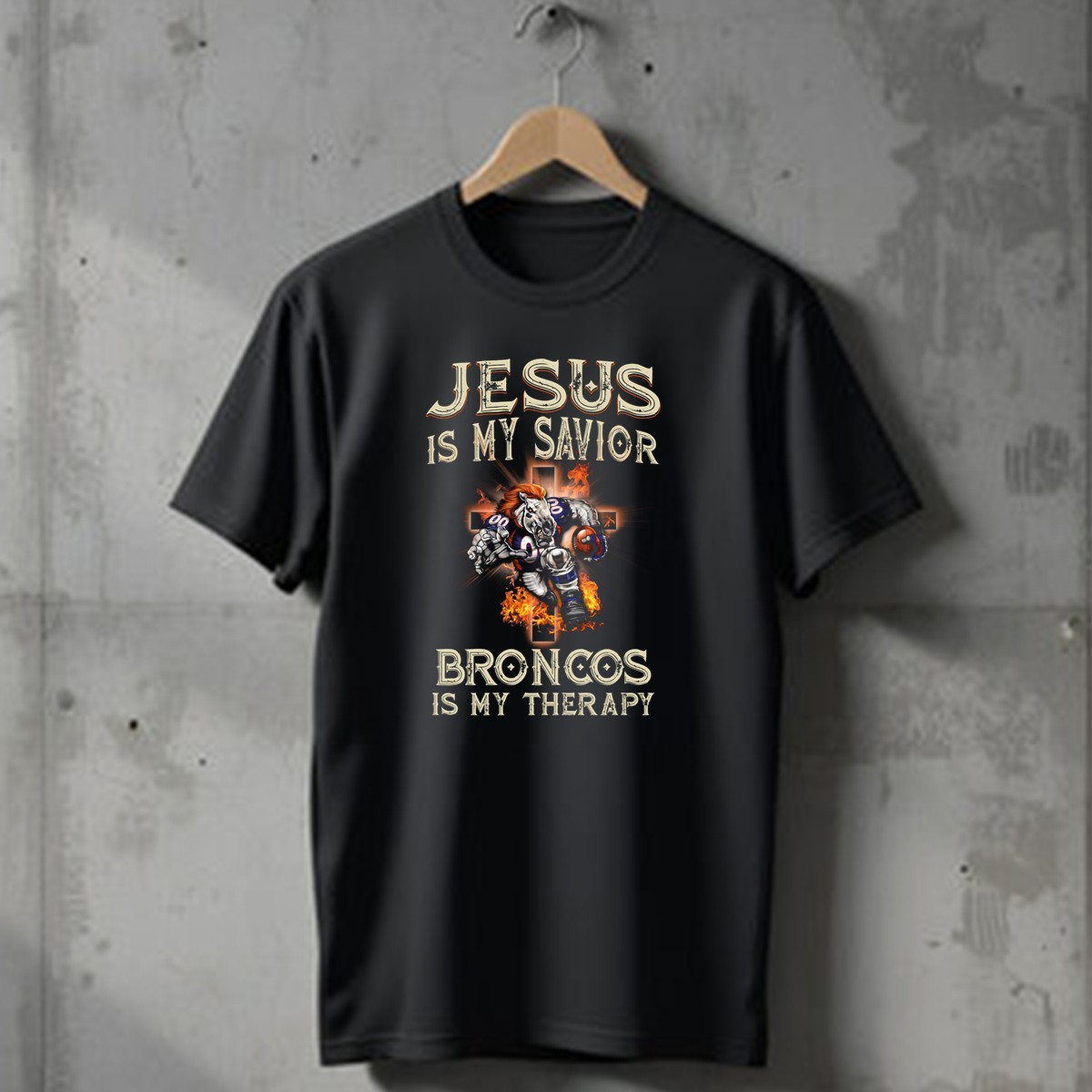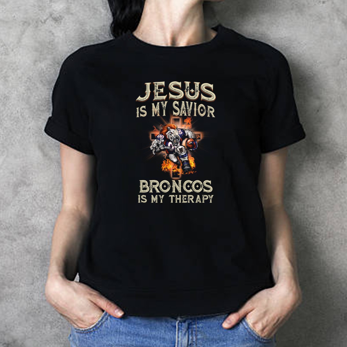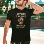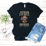 Show your unwavering faith and love for the Denver Broncos with our “Jesus Is My Savior Broncos Is My Therapy” T-shirt. Perfect for die-hard fans and believers alike, this shirt combines your passion for football with your spiritual journey. Whether you’re at a game, a casual outing, or just hanging out with friends, this unique fan-made design printed in the USA will make a statement wherever you go.