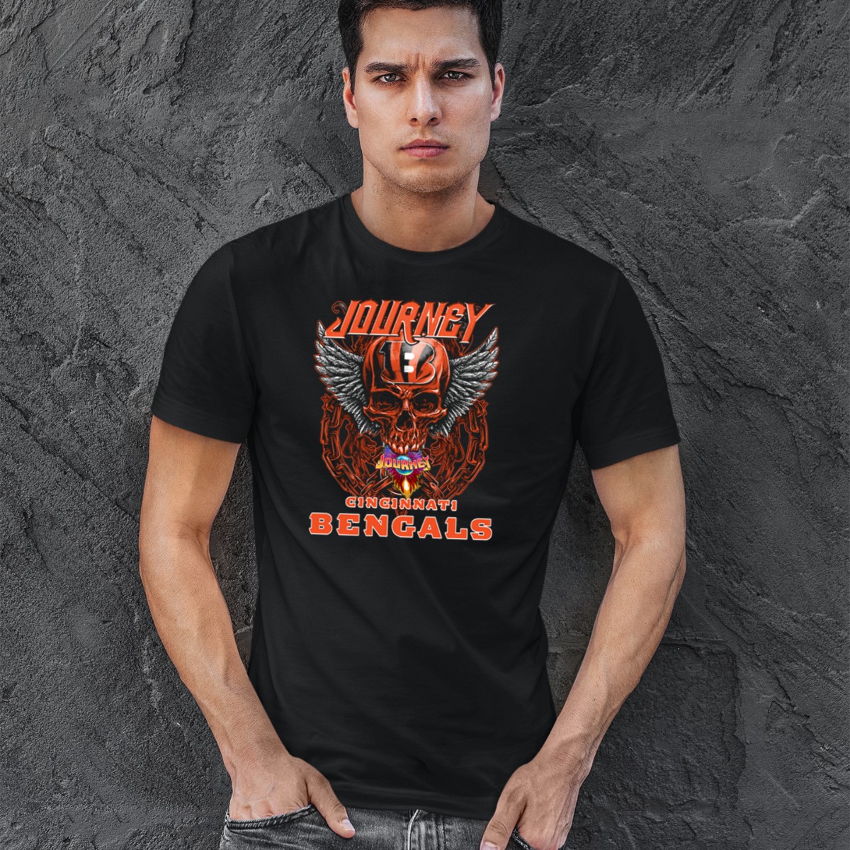 Show your fierce allegiance to the Cincinnati Bengals with our JOURNEY CINCINNATI BENGALS Skull Helmet Wings Chains Flame T-Shirt. This unique fan-made design is perfect for die-hard fans and casual wearers alike, making it an ideal choice for game days, themed events, or simply showcasing your team spirit in everyday life. Crafted with a striking graphic print, this shirt combines comfort and style, ensuring you stand out in the crowd!