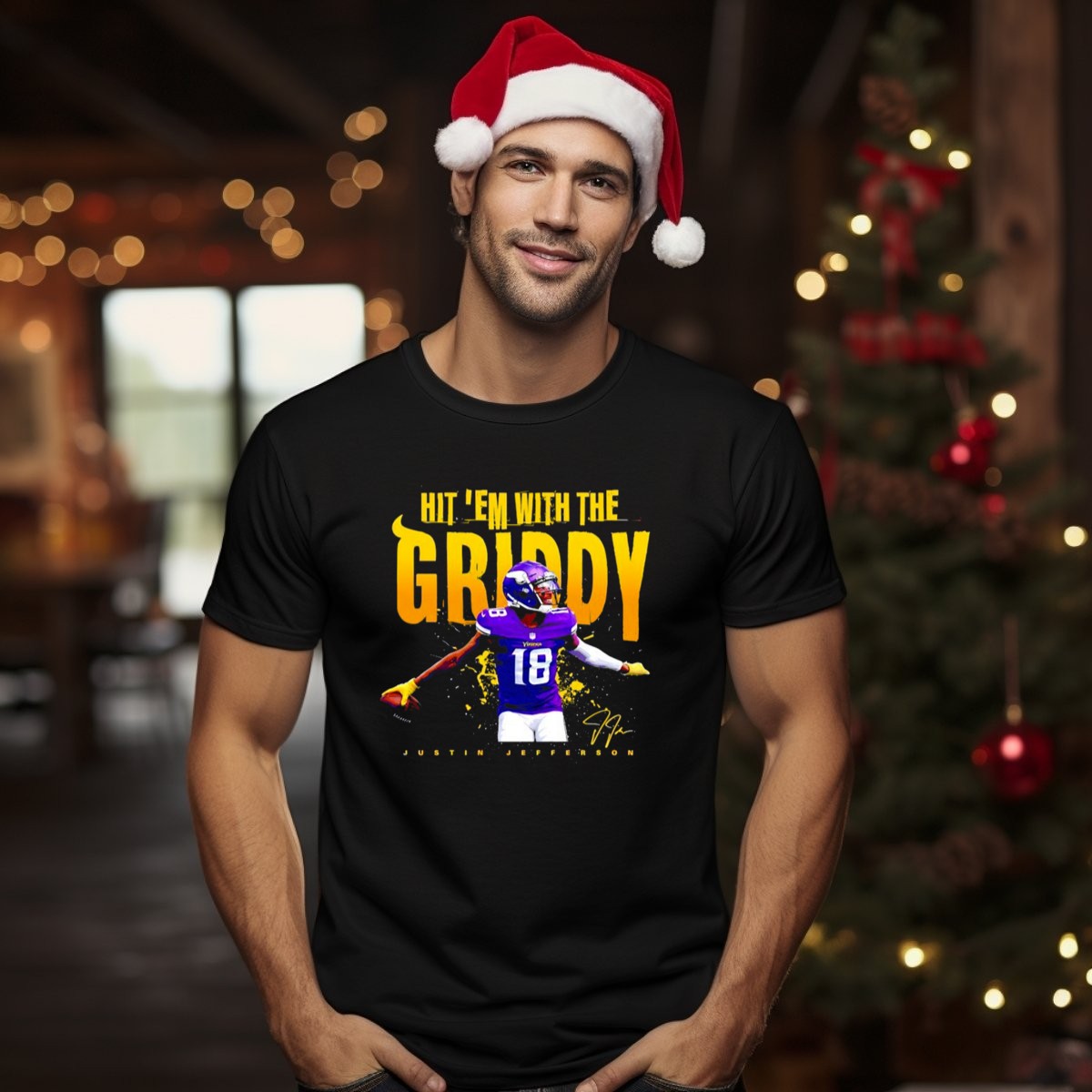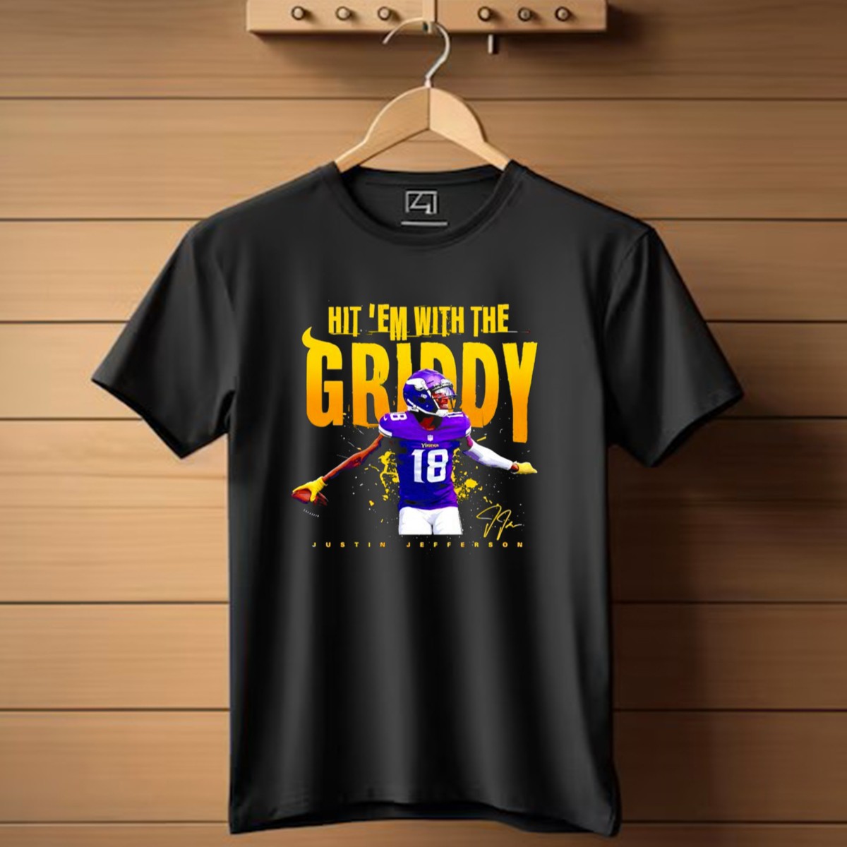 Show your love for Justin Jefferson and the Minnesota Vikings with this stylish “Hit Em With The Griddy” T-Shirt! Perfect for passionate fans, this shirt is designed for casual wear, themed events, or just everyday outings. Made for comfort and style, it features a unique fan-made graphic that showcases your team spirit while keeping you looking fresh and trendy. Printed right here in the USA, this T-Shirt is a must-have for any Vikings enthusiast!