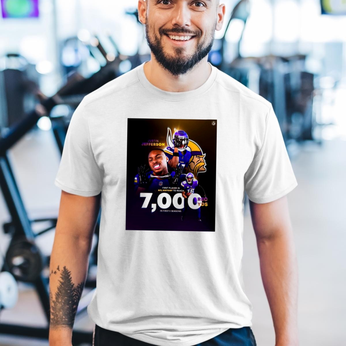 Celebrate the remarkable achievements of Justin Jefferson with this Minnesota Vikings NFL History T-shirt, designed for true fans and football enthusiasts alike. Perfect for game days, casual outings, or themed events, this shirt showcases a unique fan-made design that highlights Jefferson’s incredible milestone of 7,000 receiving yards in his first five seasons. Crafted for comfort and style, it’s a must-have for anyone looking to support their favorite player while staying effortlessly stylish.
