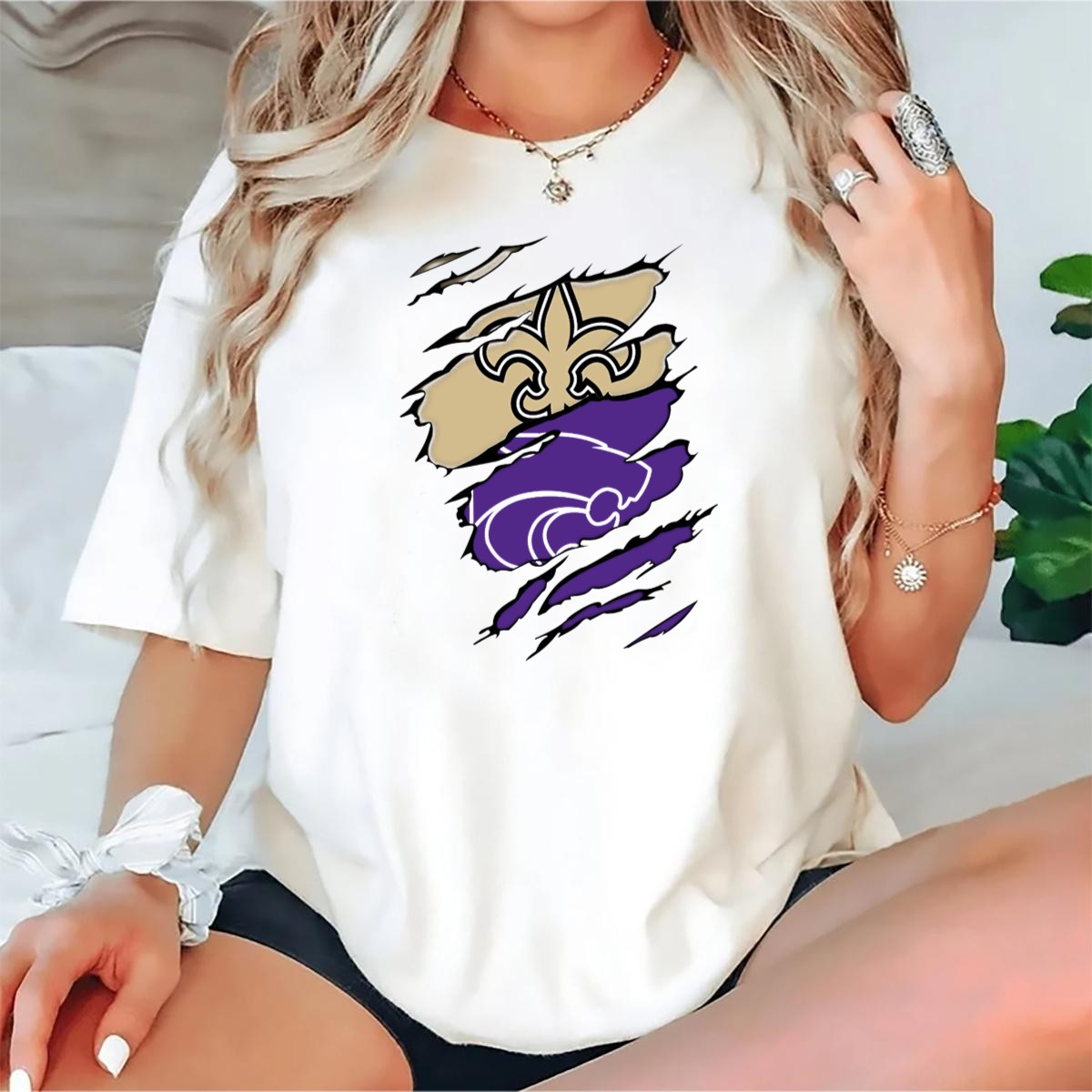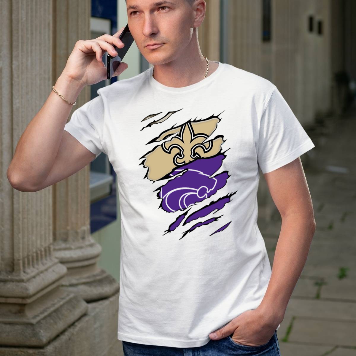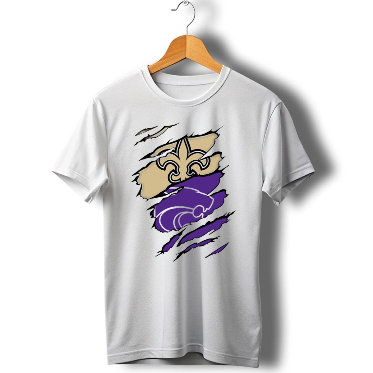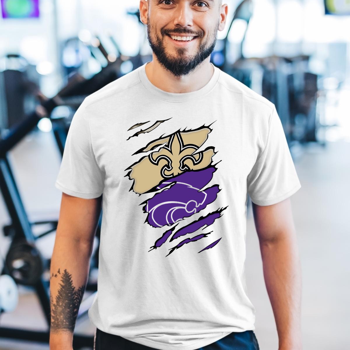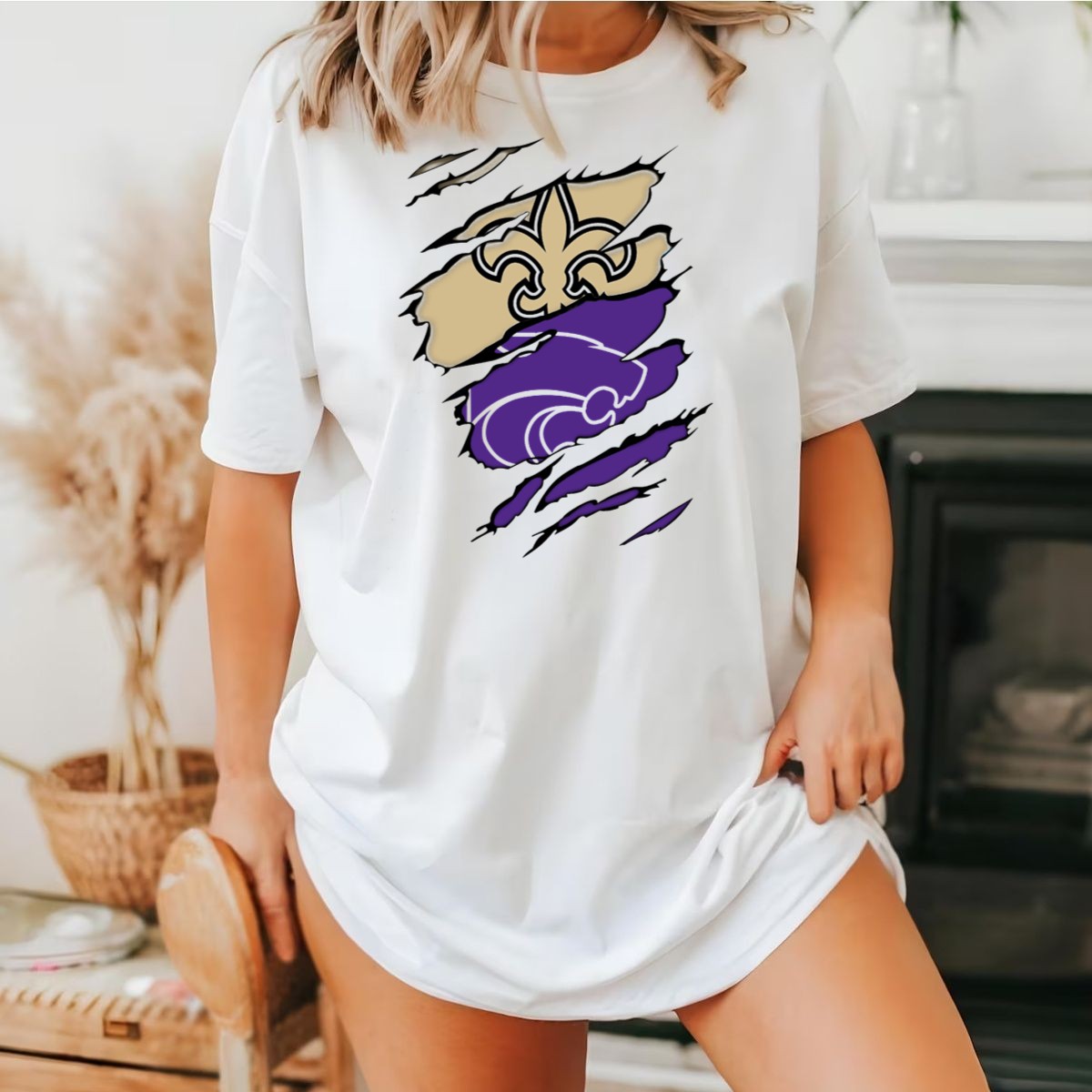 Show your team spirit with our Kansas State Wildcats and New Orleans Saints Fleur De Lis Combination T-Shirt! Perfect for fans who love to blend their passion for college and professional football, this unique design is an eye-catching way to represent both teams. Ideal for casual outings, themed events, or simply lounging around, this shirt combines comfort and style, making it a must-have for any true sports enthusiast.