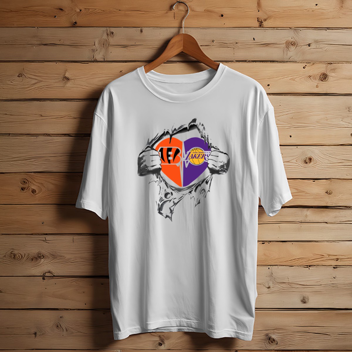 Show your love for both the Lakers and the Cincinnati Bengals with this unique fan-made T-shirt that fuses the iconic heart logo of both teams. Perfect for passionate sports fans, this shirt is ideal for casual outings, themed events, or daily wear. Made for all seasons, it combines comfort and style, making it a must-have addition to your wardrobe.