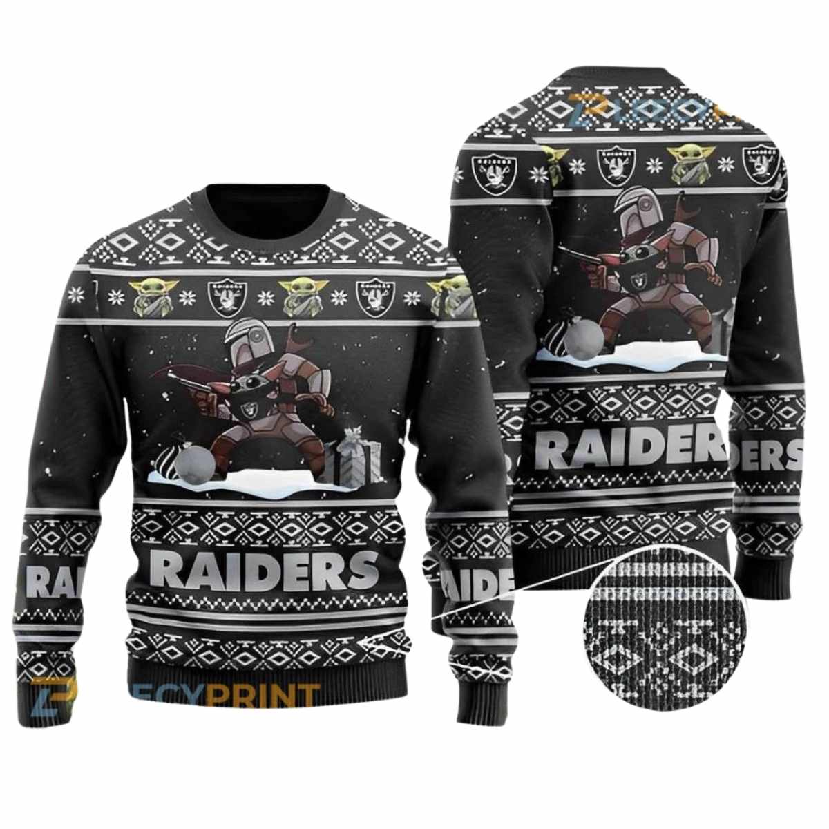 Get ready to show off your fandom in the most festive way possible with our Las Vegas Raiders Baby Yoda Boba Fett The Mandalorian Ugly Sweater! Perfect for die-hard fans and anyone who loves to embrace the holiday spirit, this sweater is ideal for parties, cozy nights in, or game day celebrations. Its unique design featuring beloved characters will have you standing out in the crowd while keeping you warm and comfortable.