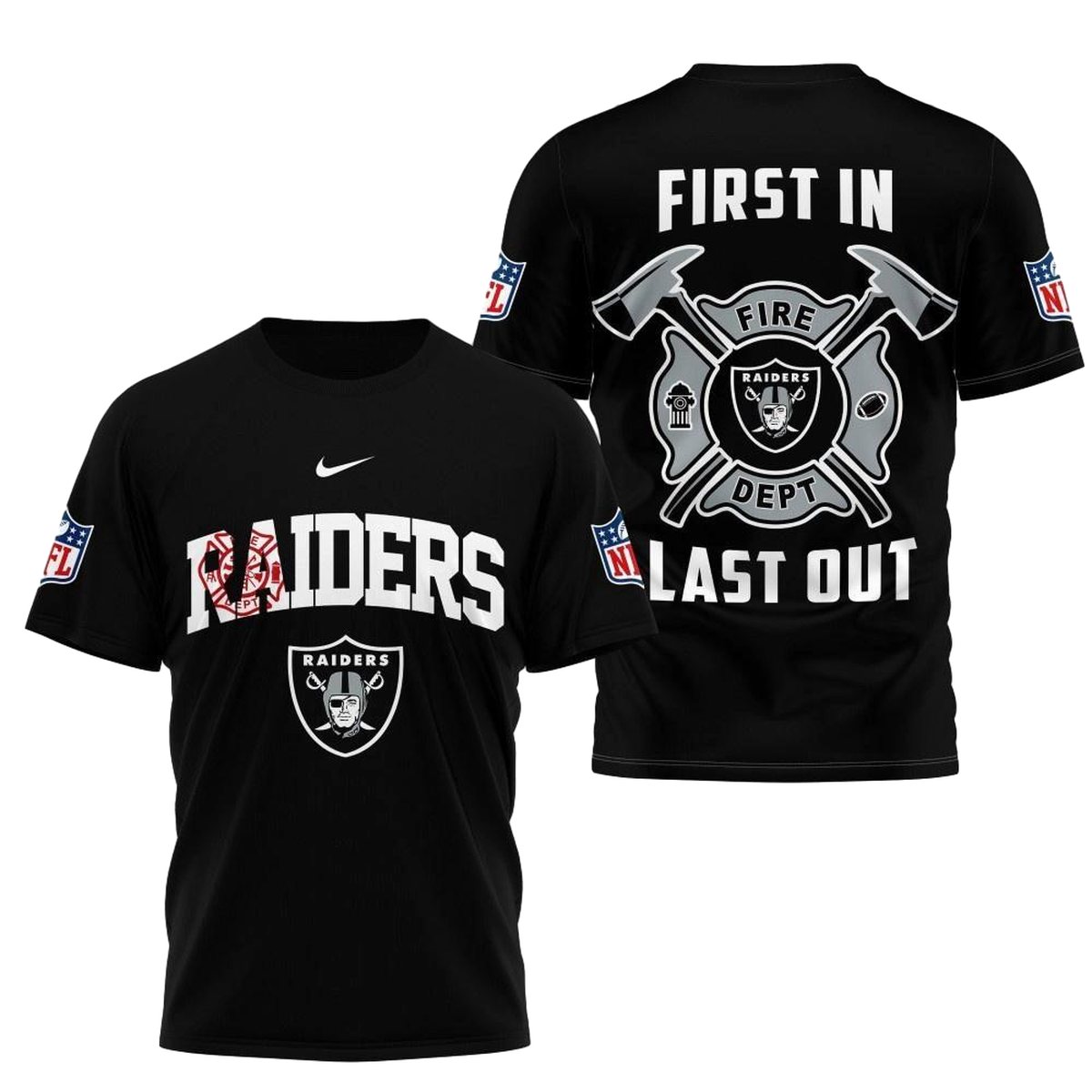 Show your team spirit with the Las Vegas Raiders Fire Dept First In Last Out AOP T-shirt! This unique graphic tee is perfect for passionate fans who want to showcase their love for the Raiders in a stylish and comfortable way. Ideal for casual outings, game days, or just hanging out with friends, this shirt is a must-have for any die-hard supporter.