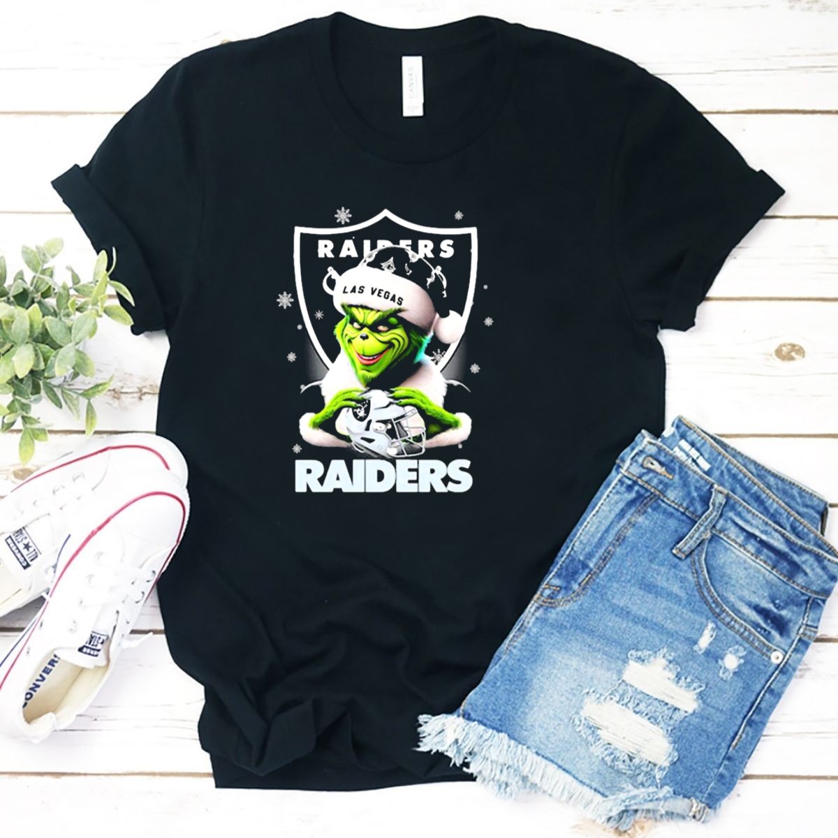 Get into the holiday spirit with our Las Vegas Raiders Grinch Santa Merry Christmas Snowflakes T-Shirt! This fan-made design is perfect for Raiders enthusiasts who want to celebrate the festive season in style. Whether you’re heading to a game, a themed event, or just enjoying casual wear with friends and family, this shirt brings a playful twist to your holiday wardrobe. Printed in the USA, its unique design combines team pride with a fun, festive flair that’s sure to turn heads!