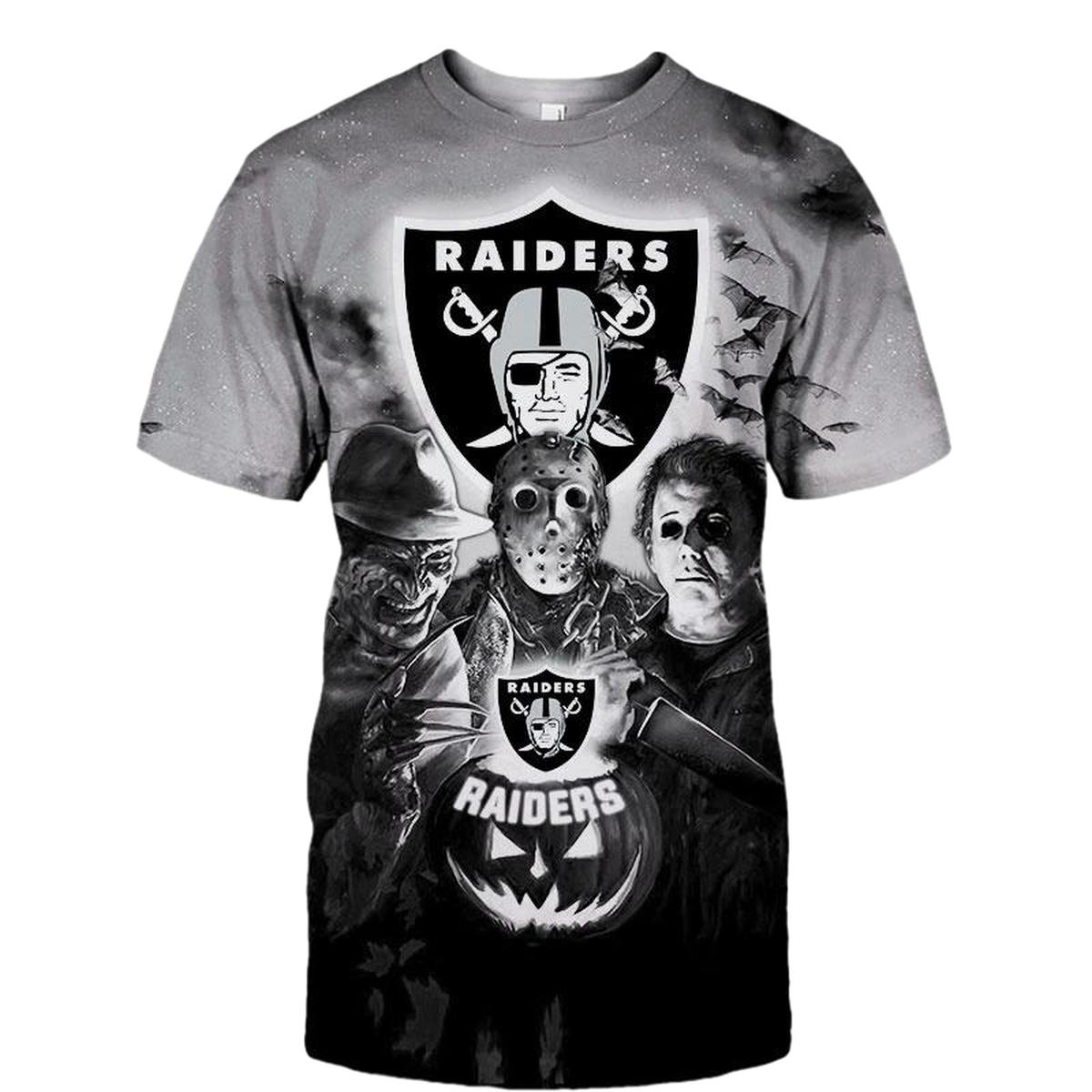 Get ready to celebrate Halloween in style with our Las Vegas Raiders Halloween Horror Night AOP T-shirt! Perfect for die-hard fans and thrill-seekers alike, this shirt is ideal for casual outings, game nights, or any festive occasion where you want to showcase your team spirit with a spooky twist. Its unique all-over print design makes it a standout piece that perfectly combines your love for the Raiders and the excitement of Halloween.