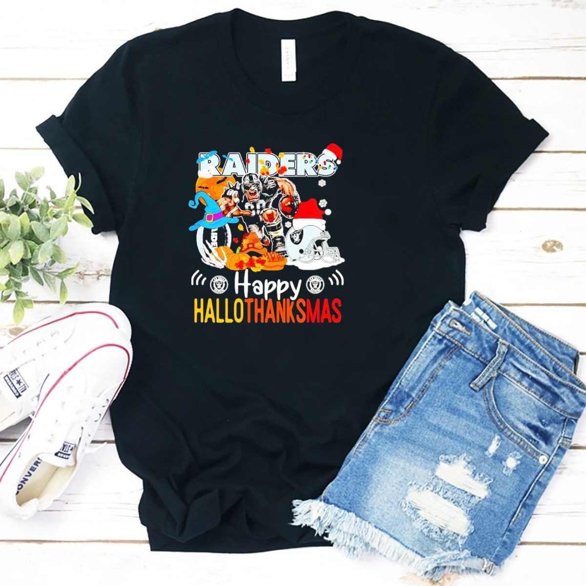 Show off your team spirit in style with our Las Vegas Raiders Happy Hallothanksmas Mascot Festive T-Shirt! Perfect for dedicated fans who love to celebrate the holidays while supporting their favorite team, this shirt is a must-have for casual outings, themed events, or just lounging at home. The fan-made design, printed in the USA, adds a unique touch to your wardrobe, making it an ideal choice for all-season wear.