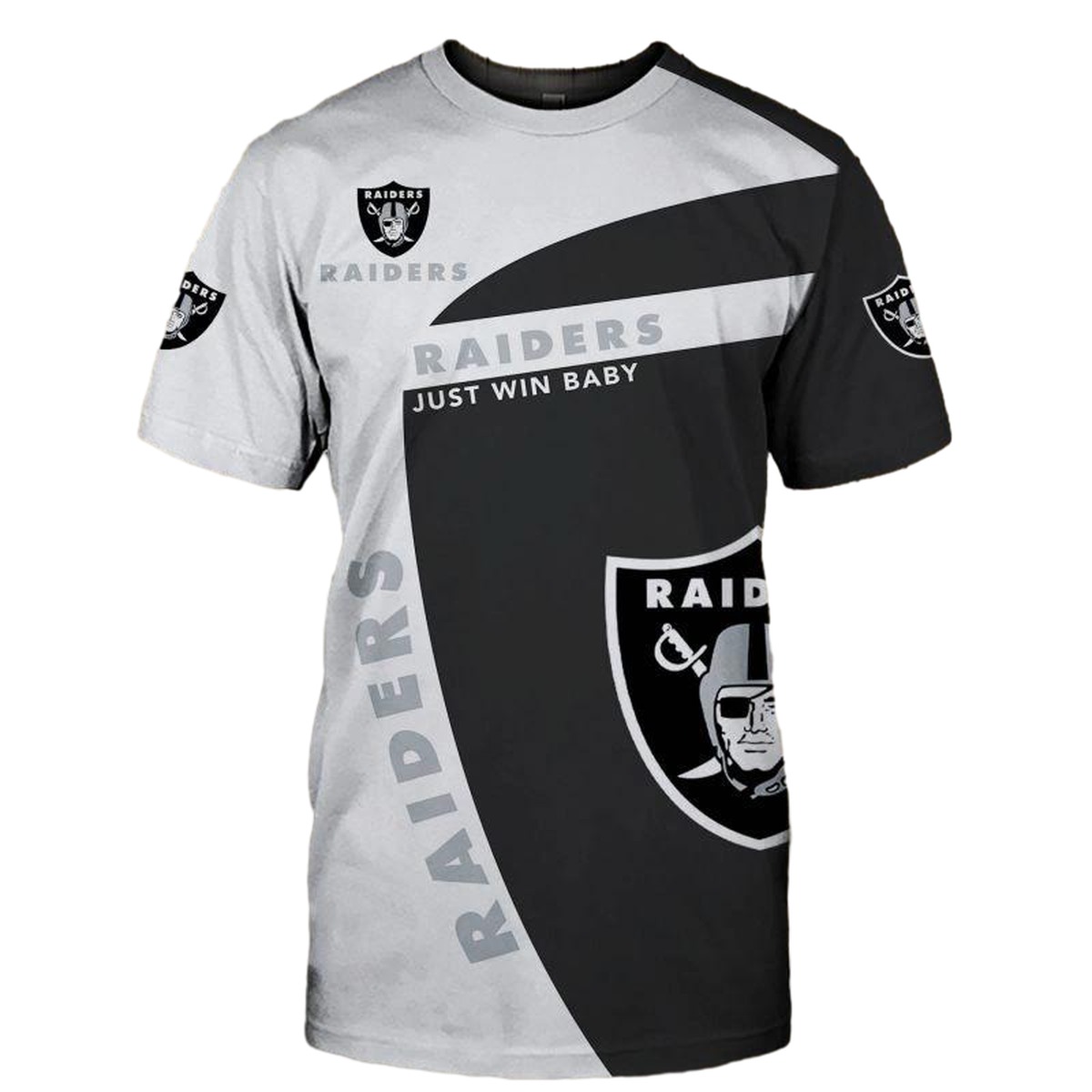 Show off your team spirit with our Las Vegas Raiders Just Win Baby AOP T-shirt! Perfect for die-hard fans, this shirt blends casual comfort with a striking graphic design that’s sure to turn heads at game day gatherings or everyday outings. Whether you’re cheering from the stands or hanging out with friends, this tee encapsulates the essence of Raiders pride.