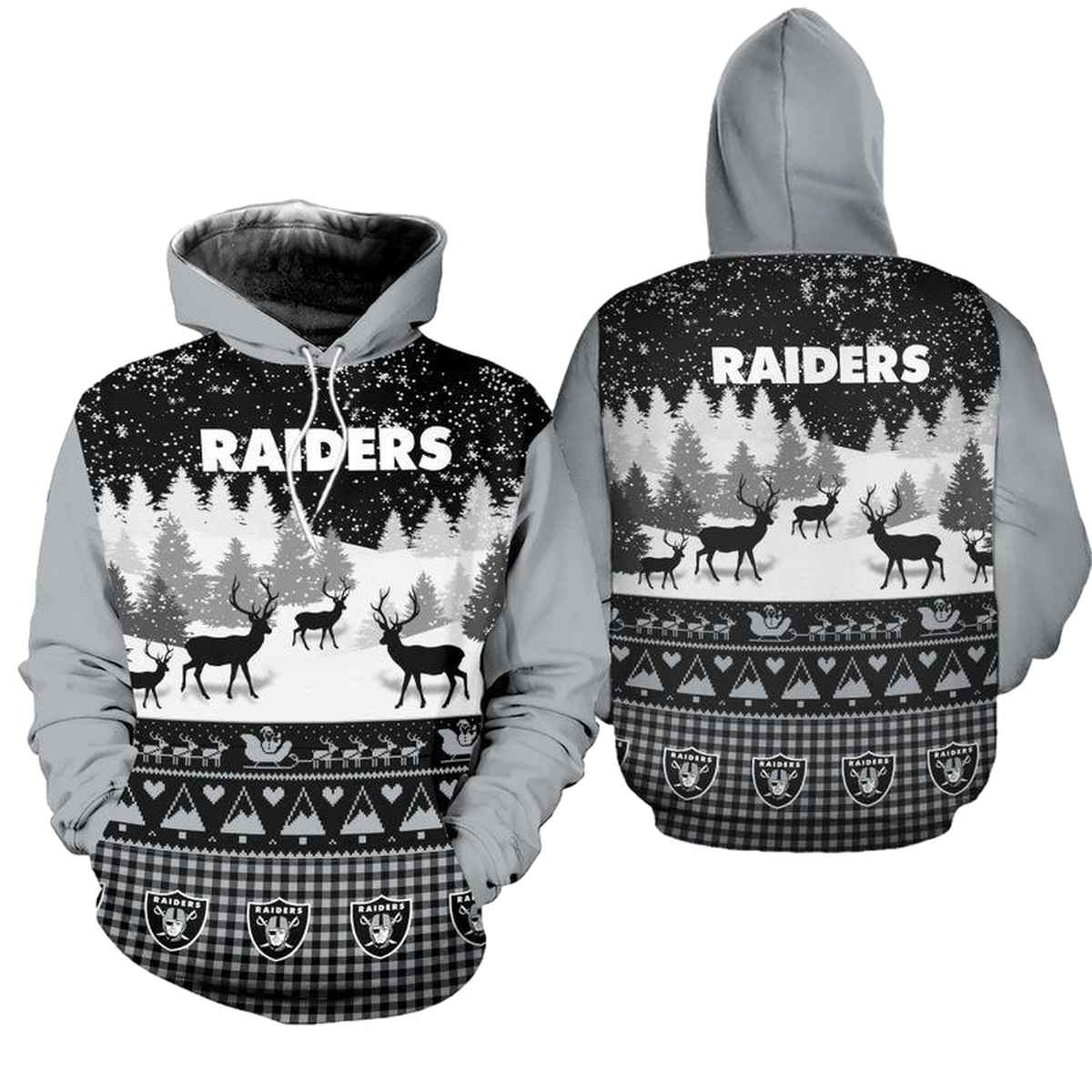 Embrace your team spirit with the Las Vegas Raiders Logo and Christmas Pattern All-Over Print Hoodie, perfect for dedicated fans who want to showcase their love for the game during the festive season. This cozy yet lightweight hoodie is ideal for casual outings, holiday gatherings, or simply lounging at home, making it a unique addition to any Raiders fan’s wardrobe.