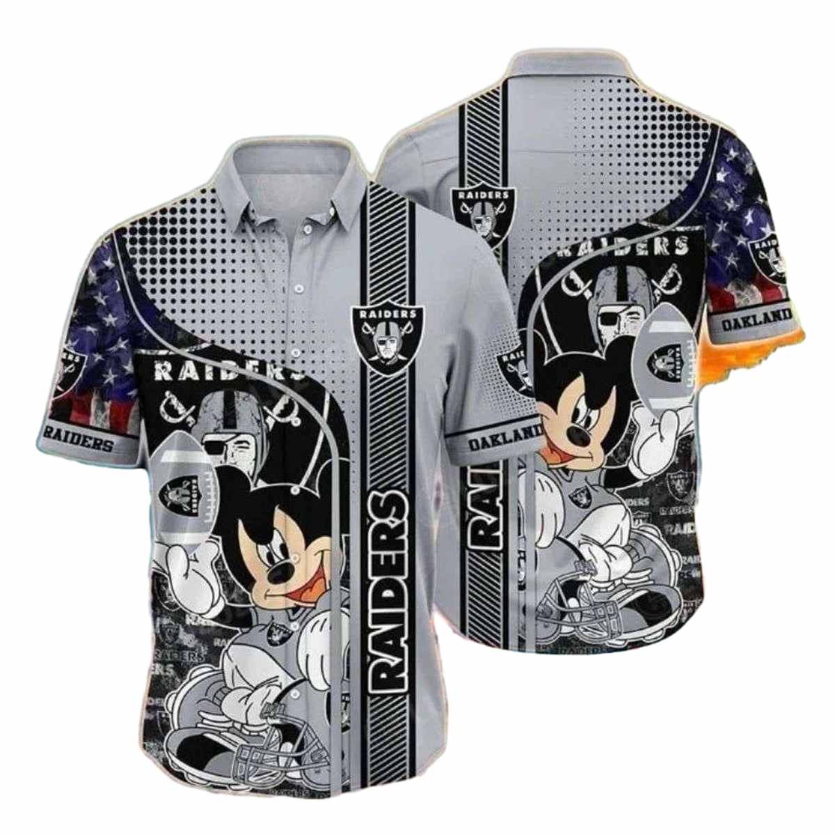 Experience the ultimate blend of style and fandom with our Las Vegas Raiders Mickey and American Flag Hawaiian shirt. Designed for passionate supporters and casual wearers alike, this shirt is perfect for summer outings, beach days, or lounging in the sun while showcasing your team spirit. The vibrant graphic print features iconic Mickey Mouse alongside the bold Las Vegas Raiders logo and the American flag, making it a unique statement piece that stands out wherever you go.