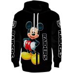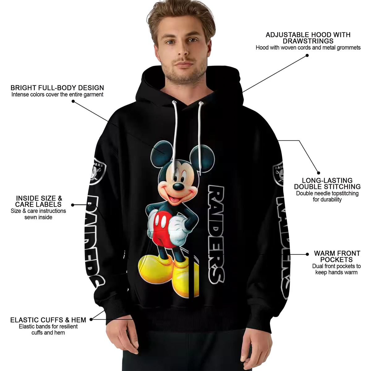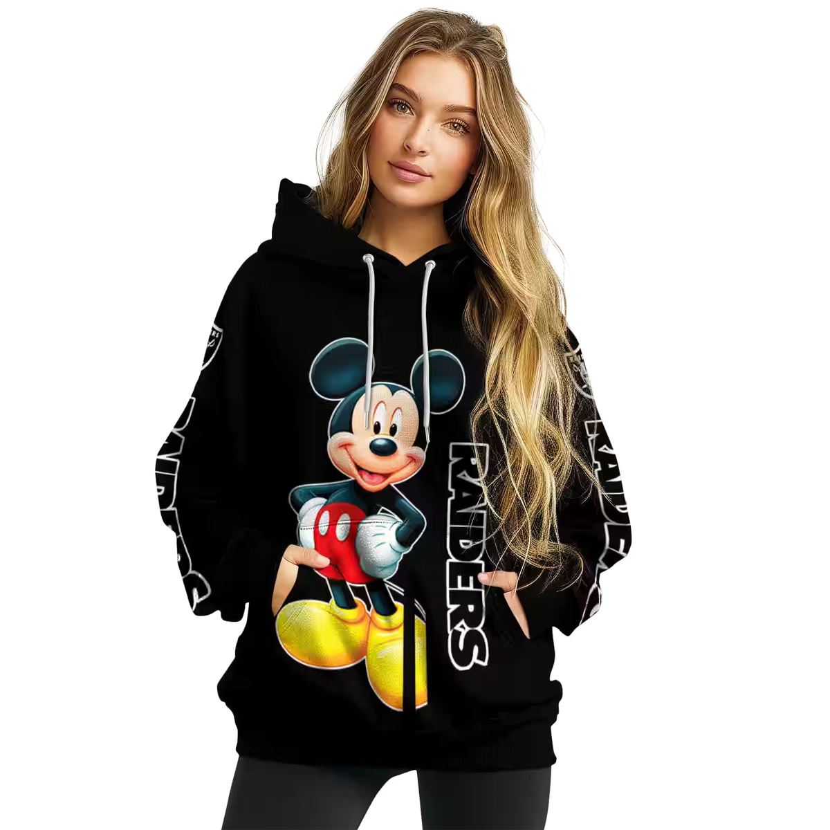 Step up your casual wardrobe with our Las Vegas Raiders Mickey Mouse Black All-Over Print Hoodie, perfect for fans who want to showcase their love for both the Raiders and Disney. This unique hoodie is designed for everyone, making it an ideal choice for daily outings, cozy hangouts, or casual outdoor activities during the cooler months. Its standout graphic print brings a playful yet sporty flair to your look, ensuring you stay stylish while supporting your favorite team.