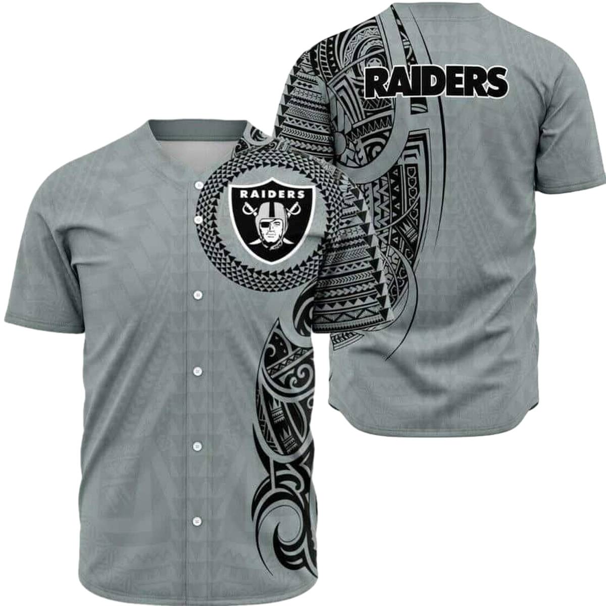 Elevate your game day style with our custom printed Las Vegas Raiders Polynesian Silver Pattern Baseball Jersey. Perfect for die-hard fans and casual wearers alike, this jersey is designed to make a statement whether you’re cheering from the stands or hitting the streets. With its bold design and relaxed fit, it’s ideal for sporting events, team gatherings, or just showing off your team spirit.