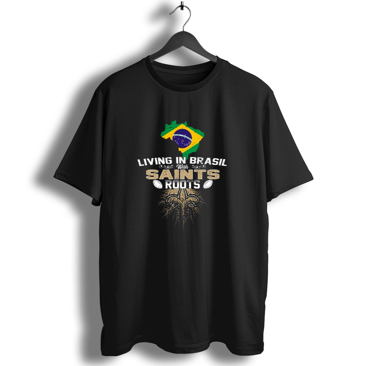 Celebrate your love for Brazil and its rich cultural heritage with our Living In Brasil With Saints Roots Football Theme T-shirt. Perfect for fans of the beautiful game, this shirt is ideal for casual outings, themed events, or simply expressing your passion for football. The unique fan-made design, proudly printed in the USA, features a vibrant Brazil map intertwined with a fleur de lis, making it a standout piece for any football enthusiast.