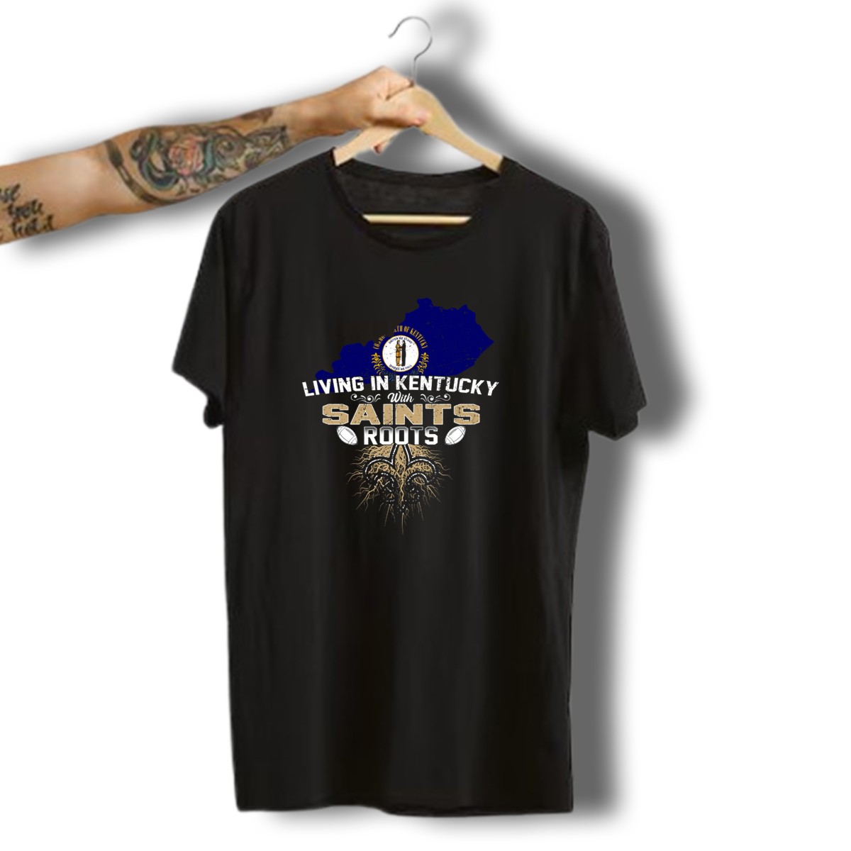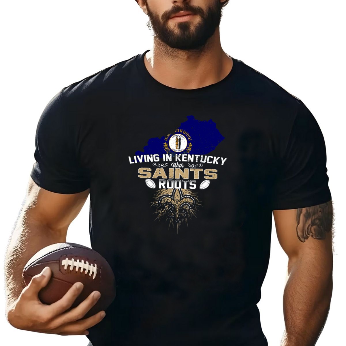 Show your pride for the Bluegrass State with our Living In Kentucky With Saints Roots T-Shirt. This fan-made design showcases a unique blend of Kentucky charm and football spirit, making it the perfect attire for casual outings, themed events, or everyday wear. Crafted for comfort and style, this shirt is ideal for anyone who loves to celebrate their roots while sporting a trendy look.