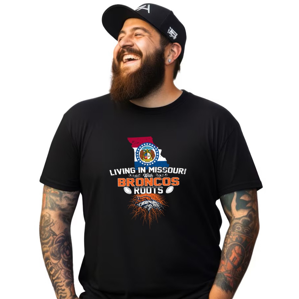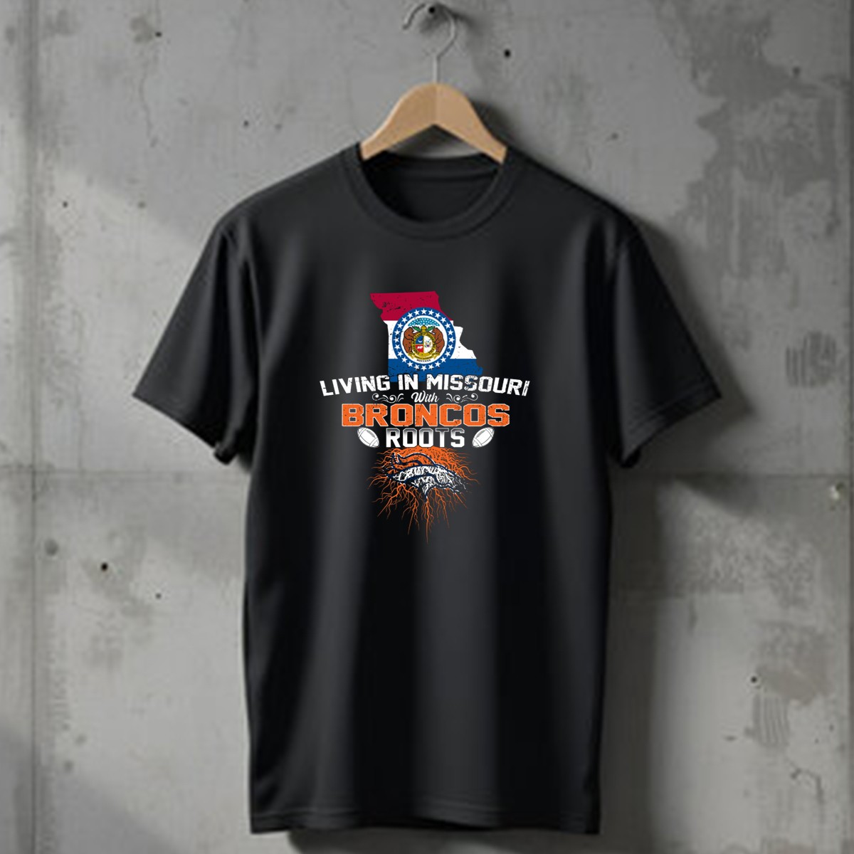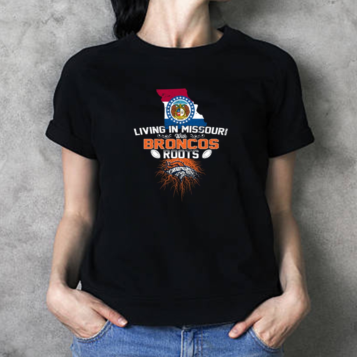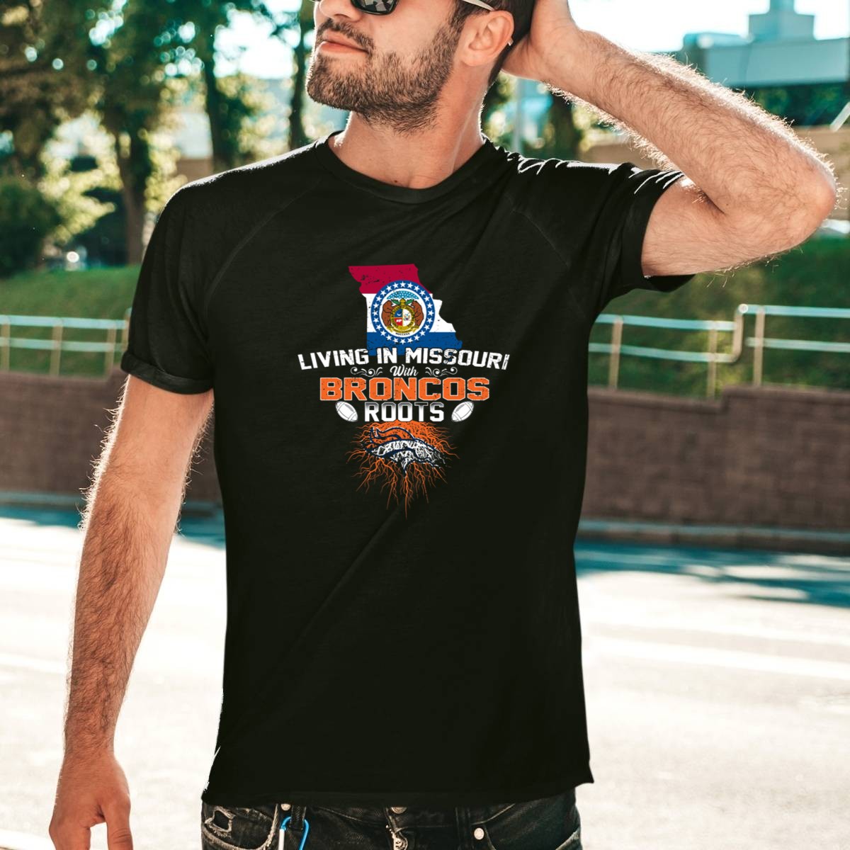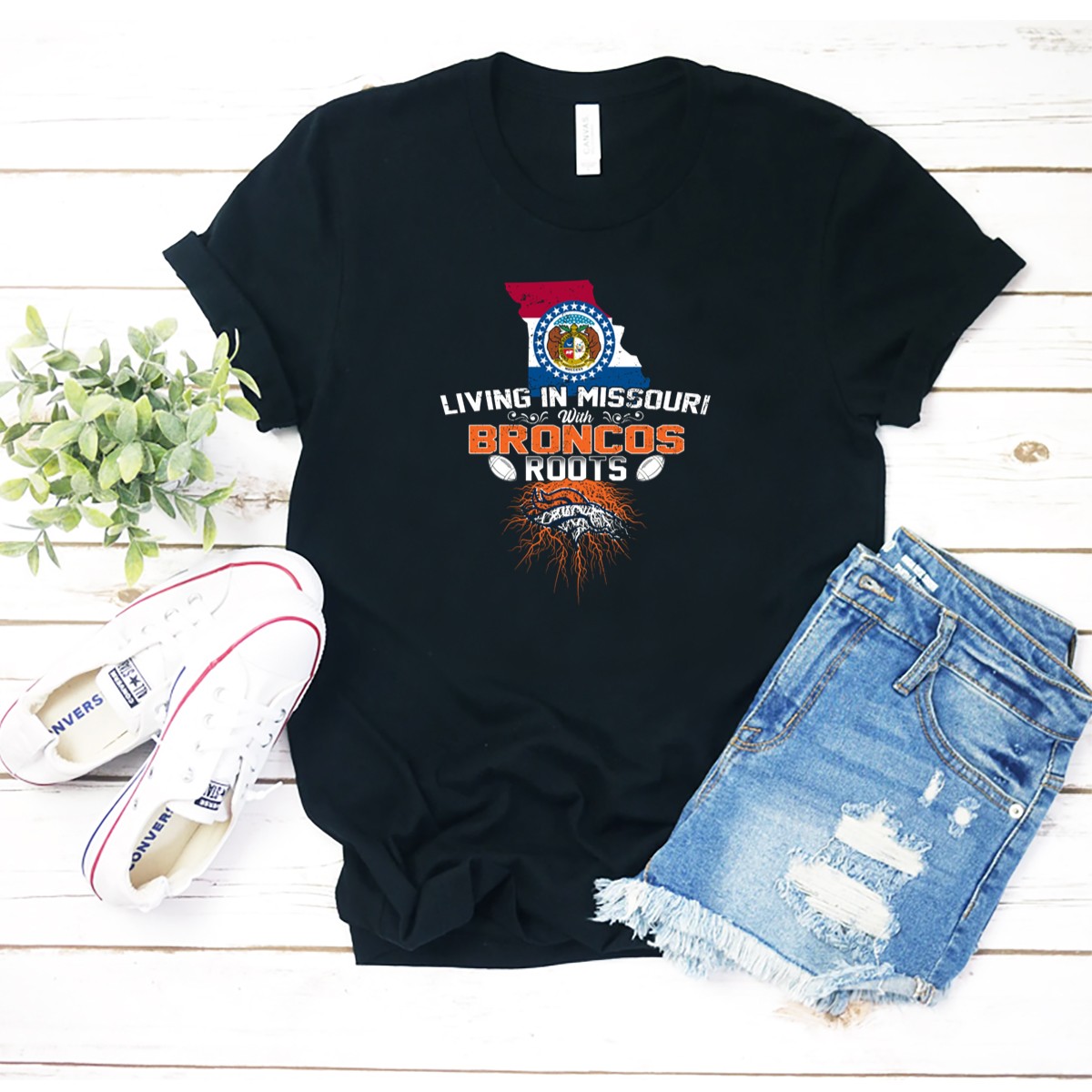 Living In Missouri With Broncos Roots Missouri State Flag Denver Broncos T-Shirt