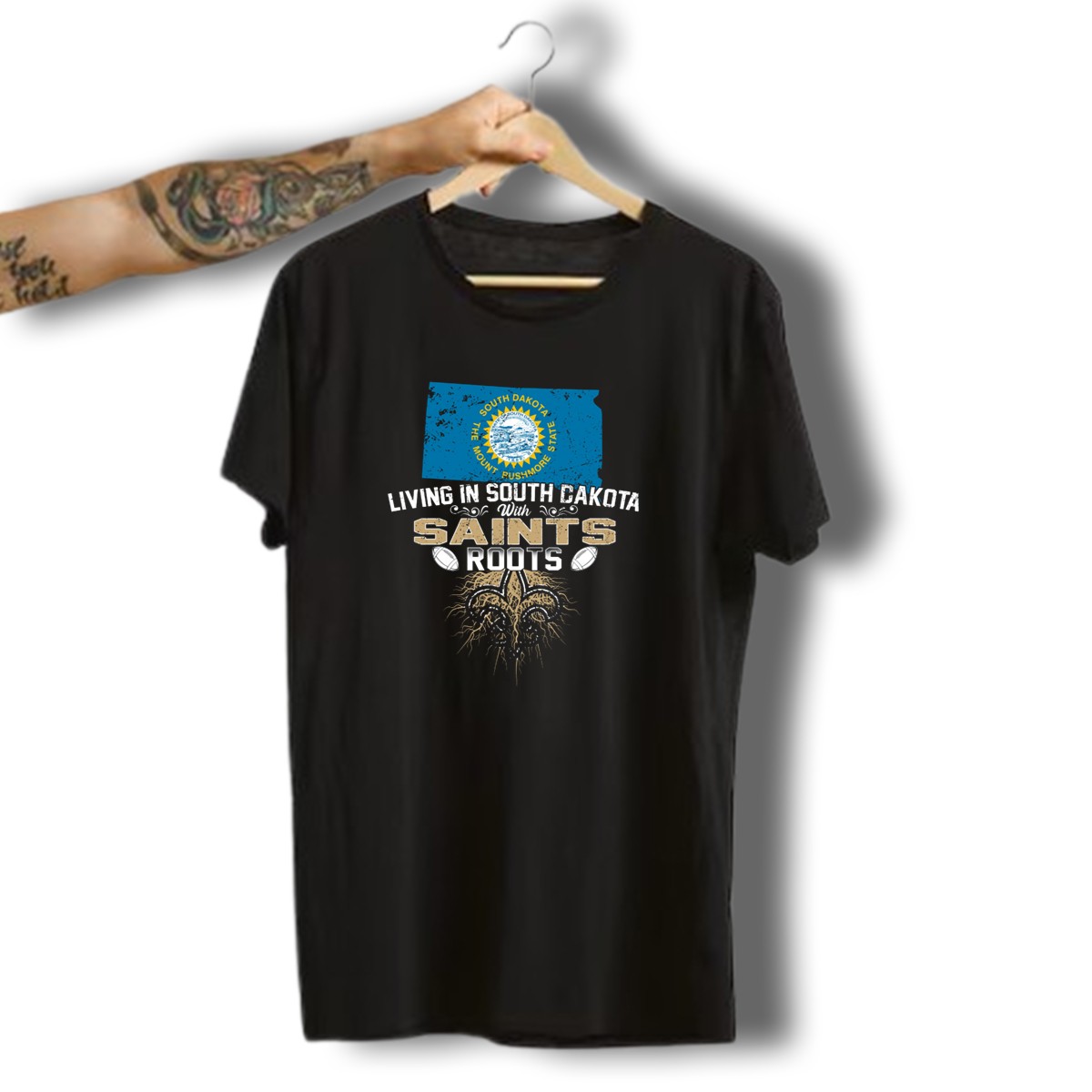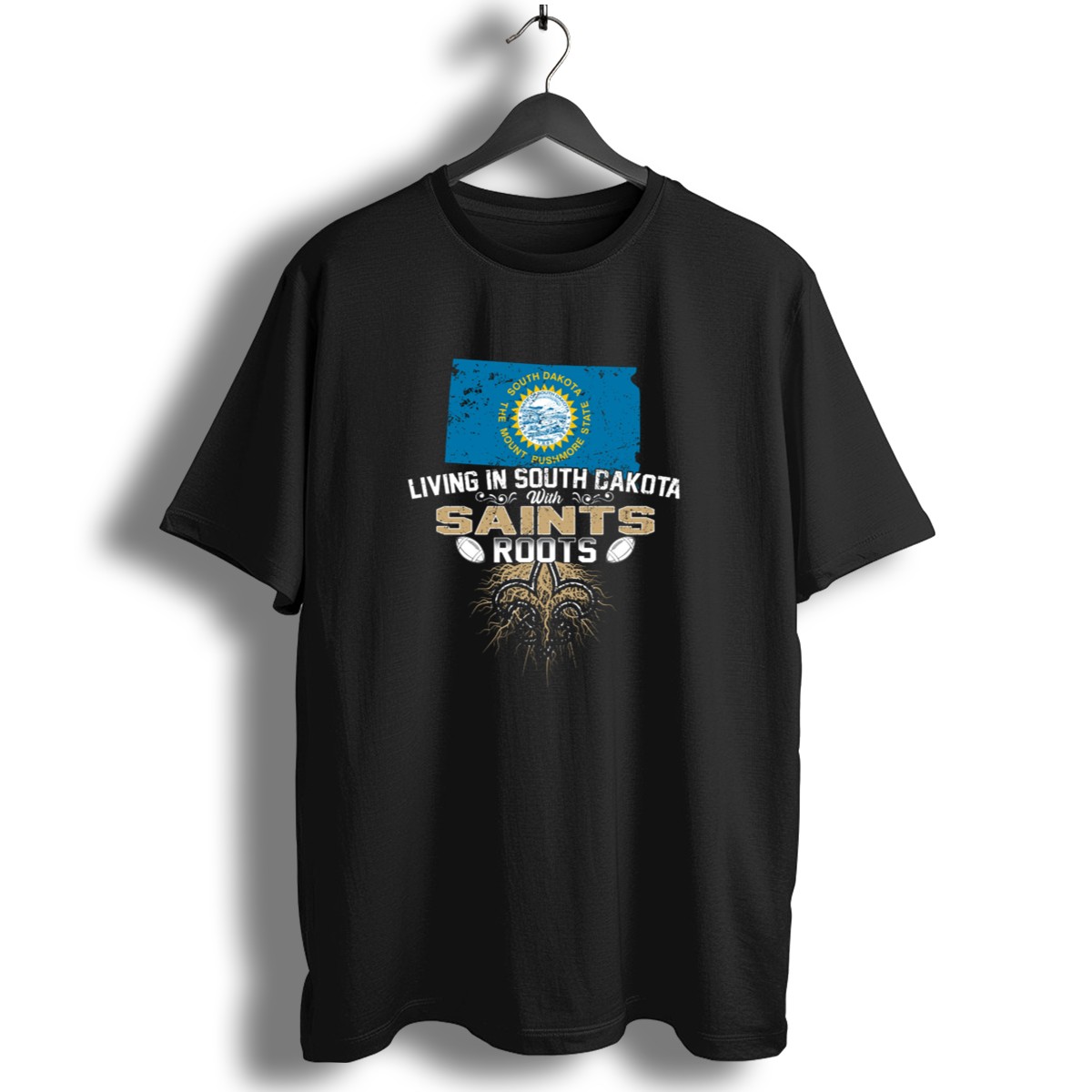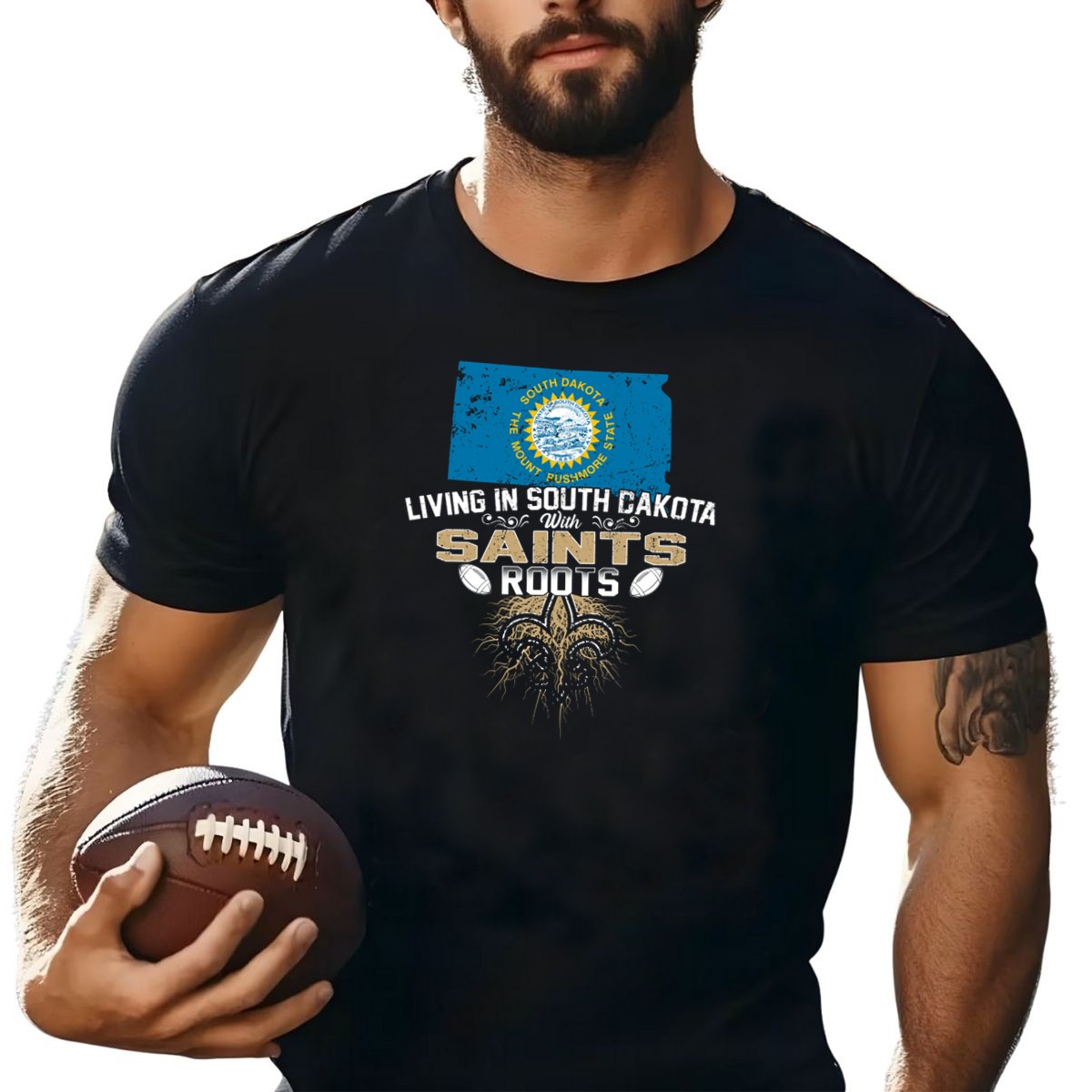 Living In South Dakota With Saints Roots Fleur De Lis And South Dakota State Flag T Shirt