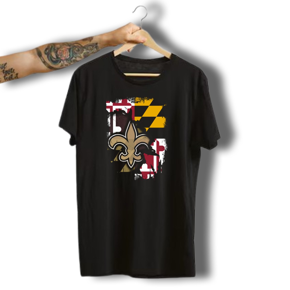 Show your Maryland pride with this unique fan-made T-shirt featuring a striking emblem adorned with the iconic Saints Fleur De Lis. Perfect for sports enthusiasts, casual outings, or themed events, this Gildan 5000 Unisex T-Shirt combines comfort and style, making it an ideal choice for daily wear in any season. Proudly printed in the USA, this shirt is a must-have for anyone looking to showcase their love for Maryland and its vibrant culture.