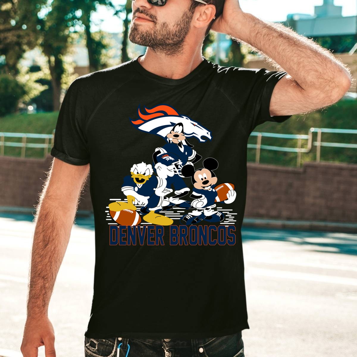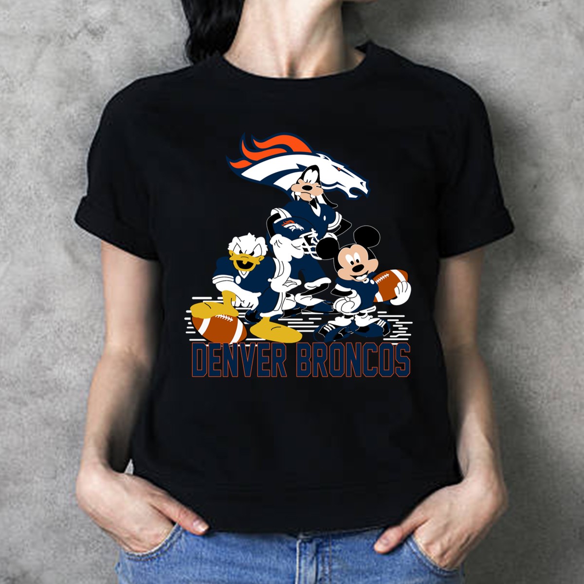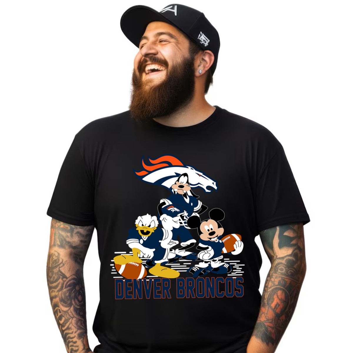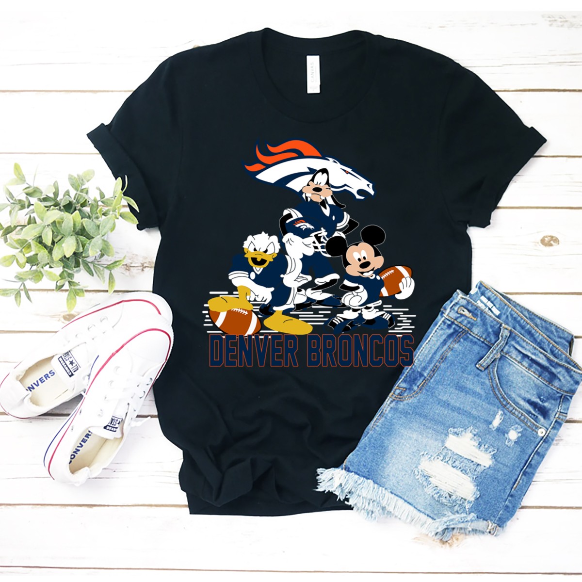 Show off your love for the Denver Broncos and classic Disney characters with this fan-made Mickey, Donald, and Goofy T-shirt! Perfect for die-hard fans and Disney enthusiasts alike, this shirt is a fantastic choice for casual outings, themed events, or just lounging at home. Its unique design, printed right here in the USA, combines sporty spirit with a touch of nostalgia, making it a must-have for any Broncos supporter looking to showcase their team pride in style.