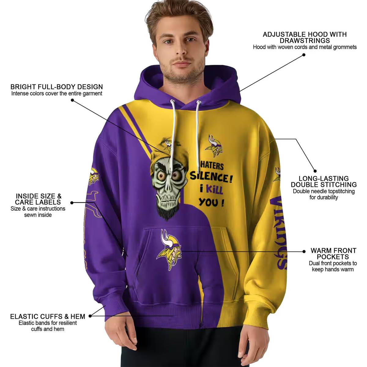 Introducing the Minnesota Vikings Achmed Skull Purple Yellow All-Over Print Hoodie, a must-have for fans who want to showcase their team spirit in style. This unique hoodie is perfect for casual outings, game days, or simply lounging at home. With its eye-catching design and relaxed fit, it’s ideal for both men and women who appreciate comfort and flair.