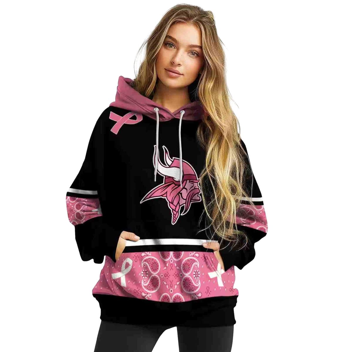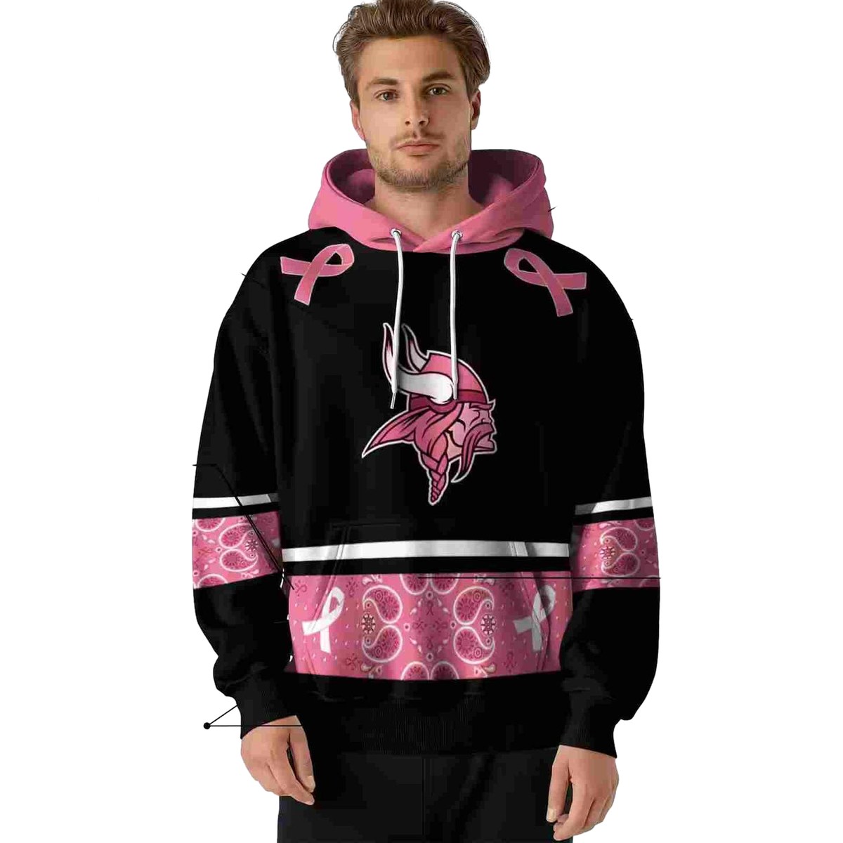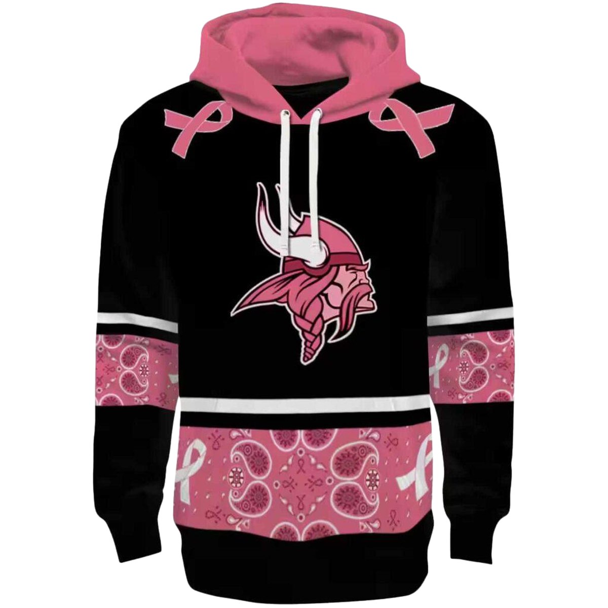 Show your support for a cause close to your heart with the Minnesota Vikings Awareness Ribbon Black Pink All-Over Print Hoodie. Perfect for both men and women, this hoodie is ideal for casual outings, game days, or simply lounging around at home. Its unique design sets you apart while keeping you cozy and stylish.