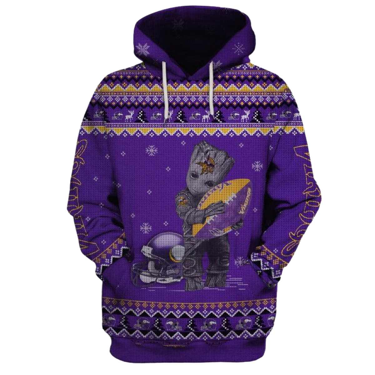 Minnesota Vikings Baby Groot Hug Ball Ugly Christmas AOP Hoodie