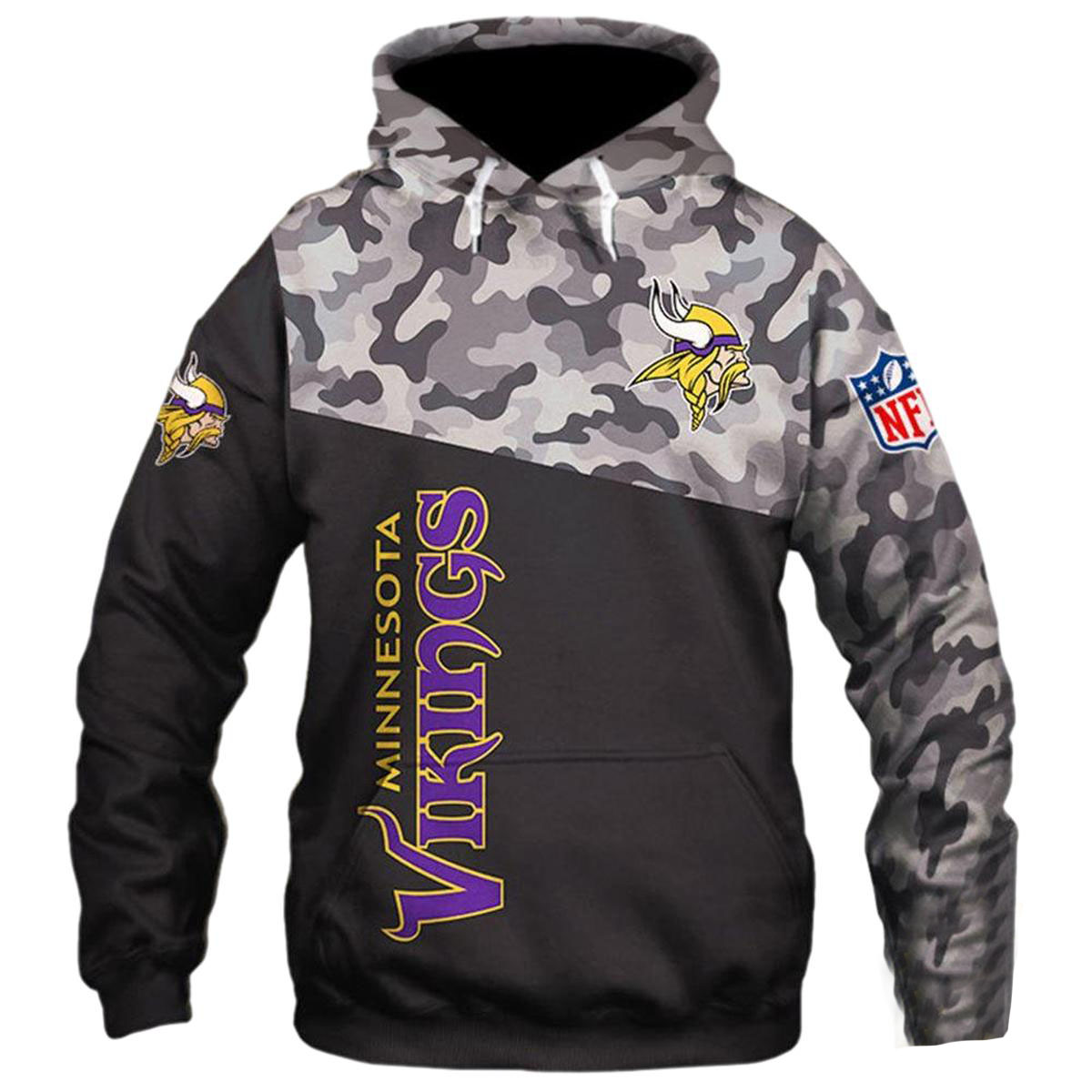 Embrace your team spirit with our Minnesota Vikings Camo And Black All-Over Print Hoodie, designed for the ultimate fan who enjoys a blend of style and comfort. Perfect for casual outings, game days, or cozy evenings at home, this hoodie features a unique camo design that sets you apart while showcasing your loyalty to the Vikings. Its relaxed fit makes it a versatile choice for both men and women, ensuring everyone can join in on the fun.