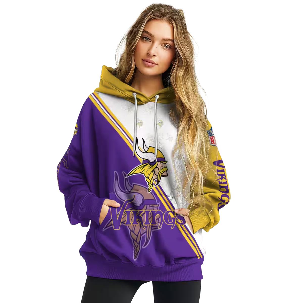 Show your team spirit in style with the Minnesota Vikings Diagonal Stripe Purple White AOP Hoodie, perfect for avid fans and casual wearers alike. Ideal for game days or relaxed weekends, this hoodie combines comfort and flair, making it a unique addition to any wardrobe.