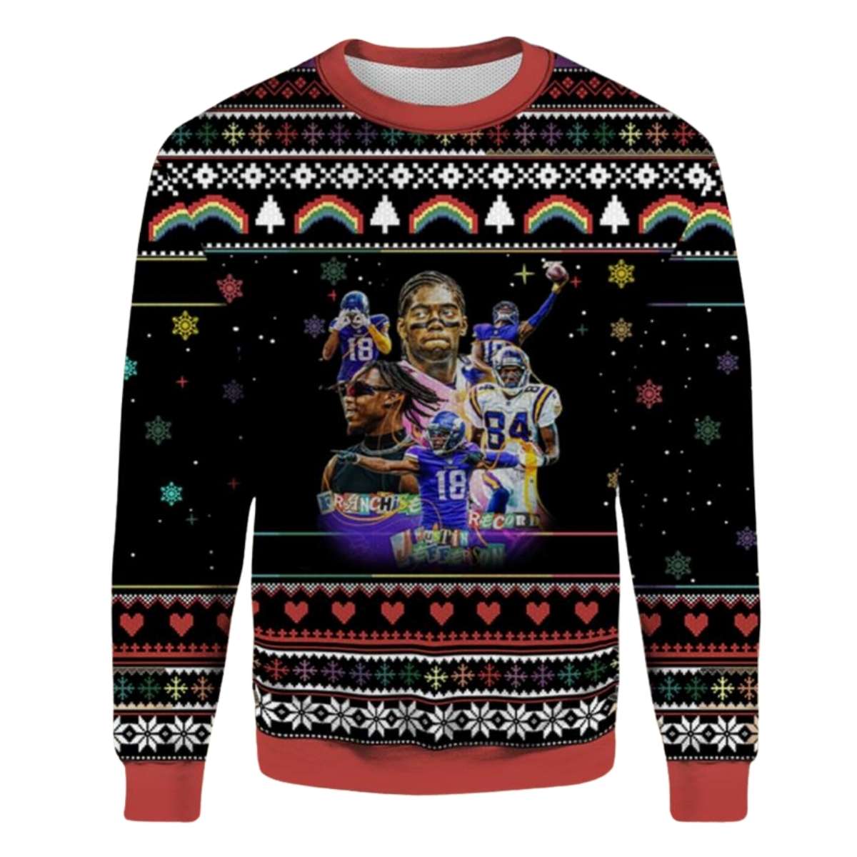 Get ready to show off your team spirit with our Minnesota Vikings Franchise Record Justin Jefferson Ugly Sweater! Perfect for die-hard fans and those who just love a good laugh, this cozy pullover is ideal for game days, holiday parties, or lounging around the house. With its unique design featuring the legendary Justin Jefferson, this sweater combines festive flair with a touch of football pride, making it a must-have for any Vikings enthusiast.