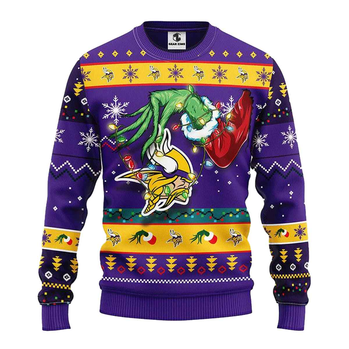 Get ready to spread some holiday cheer with our Minnesota Vikings Grinch Hand Ugly Sweater! Perfect for die-hard fans and festive spirit enthusiasts alike, this cozy sweater is your go-to for holiday parties, game days, or simply lounging at home. With a playful design featuring the Grinch’s mischievous hand, it’s a unique twist that brings both fun and warmth to your winter wardrobe.