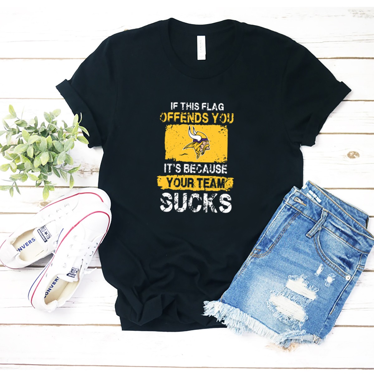 Show off your team spirit with the Minnesota Vikings “If This Flag Offends You It’s Because Your Team Sucks” T-shirt! Designed for die-hard Vikings fans, this shirt is perfect for casual outings, themed events, or just lounging around on game day. Made with a unique fan-made design, it proudly displays your loyalty in a fun and bold way, making it a must-have addition to any fan’s wardrobe.
